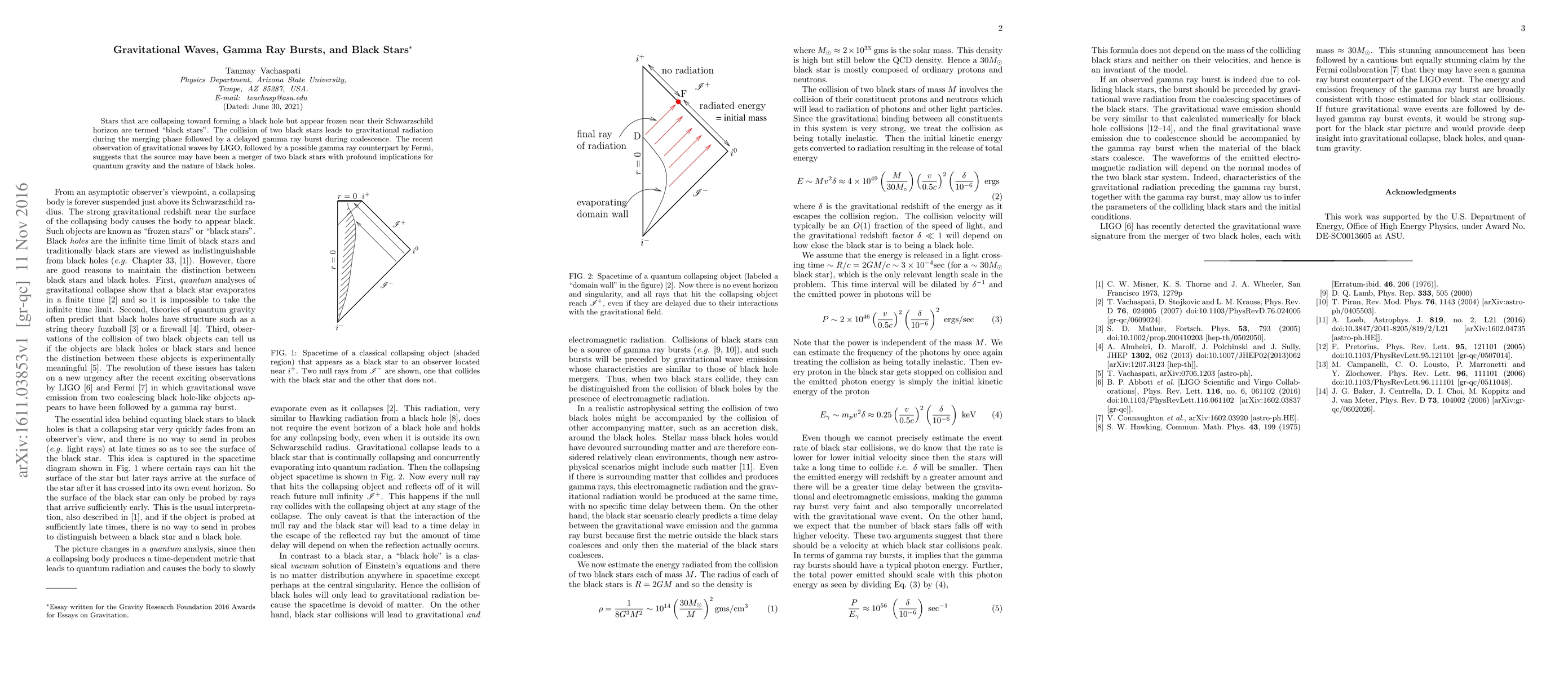 The paper proposes a theoretical analysis of 'black stars' - stars frozen near the Schwarzschild horizon, colliding and merging, leading to gravitational waves and delayed gamma-ray bursts. It draws on recent LIGO and Fermi observations suggesting a black star merger as the source.
