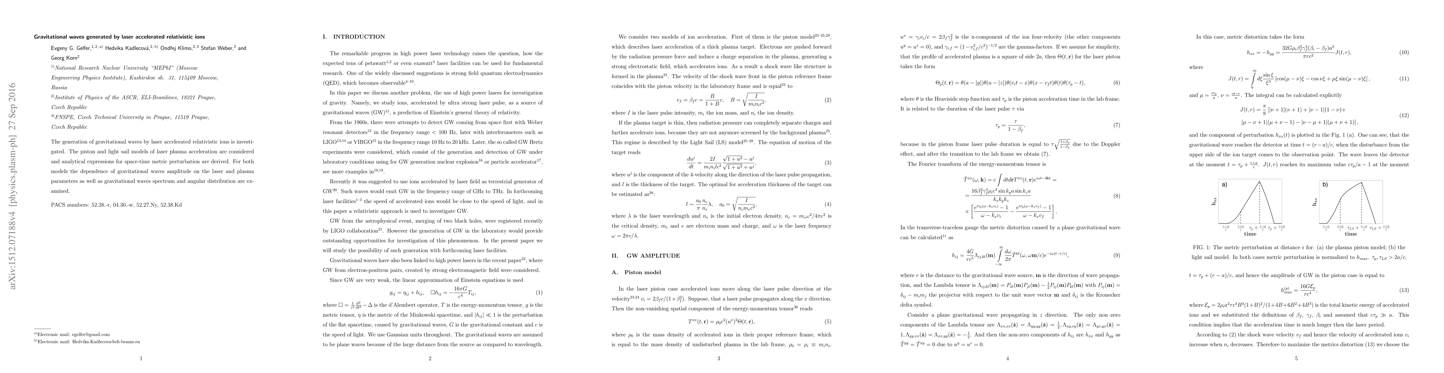 This paper investigates gravitational waves produced by laser-accelerated relativistic ions using piston and light sail models, deriving analytical expressions for space-time metric perturbations and examining the dependence of gravitational wave amplitude, spectrum, and angular distribution on laser and plasma parameters.