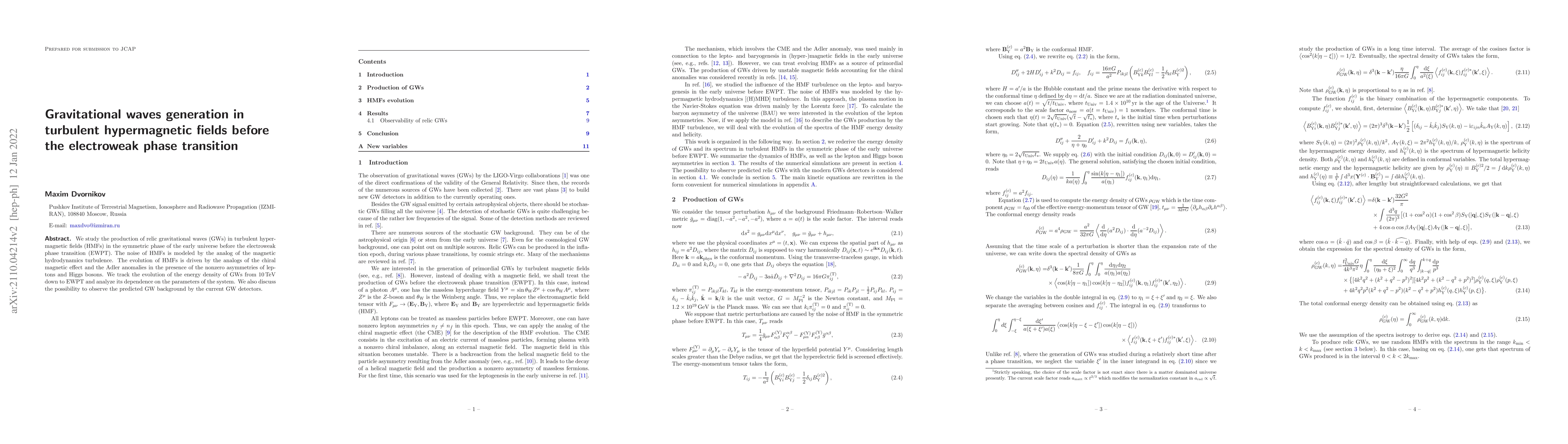 This paper investigates the generation of relic gravitational waves in turbulent hypermagnetic fields during the early universe's symmetric phase before the electroweak phase transition. It models the fields' noise using magnetic hydrodynamics turbulence and explores the influence of chiral magnetic effects and Adler anomalies on their evolution, analyzing the resulting gravitational wave energy density and its detectability by current detectors.