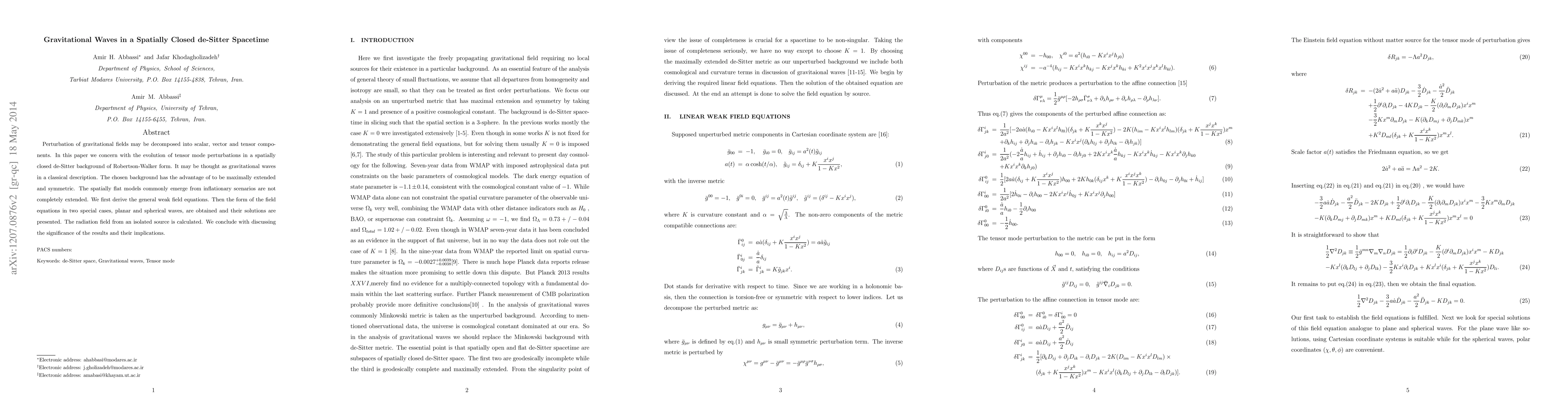 Perturbation of gravitational fields may be decomposed into scalar,vector and tensor components.In this paper we concern with the evolution of tensor mode perturbations in a spatially closed deSitter background of RW form. It may be thought as gravitional waves in a classical description. The chosen background has the advantage of to be maximally extended and symmetric. The spatially flat models commonly emerge from inflationary scenarios are not completely extended.We first derive the general weak field equations.Then the form of the field equations in two special cases, planar and spherical waves are obtained and their solutions are presented. We conclued with discussing the significance of the results and their implications.