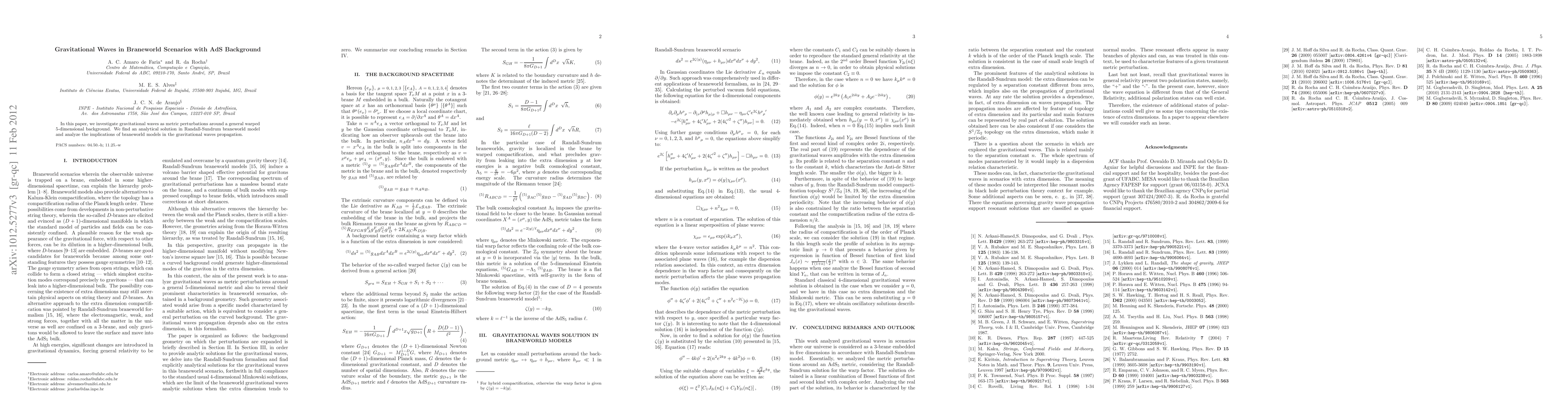This paper explores gravitational waves as metric perturbations in a 5-dimensional warped background, deriving an analytical solution in the Randall-Sundrum model and examining how braneworld scenarios affect gravitational wave propagation.