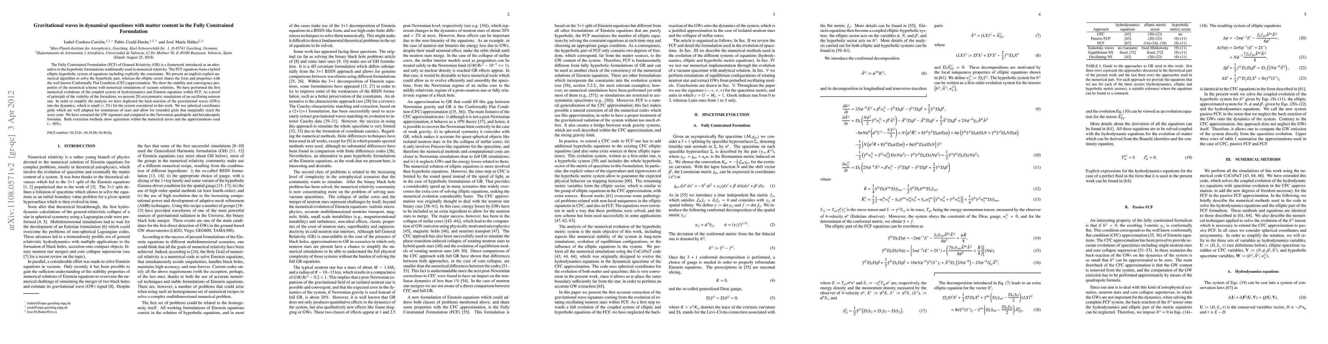 This paper introduces the Fully Constrained Formulation (FCF) for solving General Relativity, presenting an implicit-explicit numerical algorithm for its hyperbolic part and demonstrating its stability through vacuum simulations. The authors perform 2D axisymmetric simulations of an oscillating neutron star, extracting gravitational wave signatures that agree with Newtonian formulae within acceptable numerical error margins.