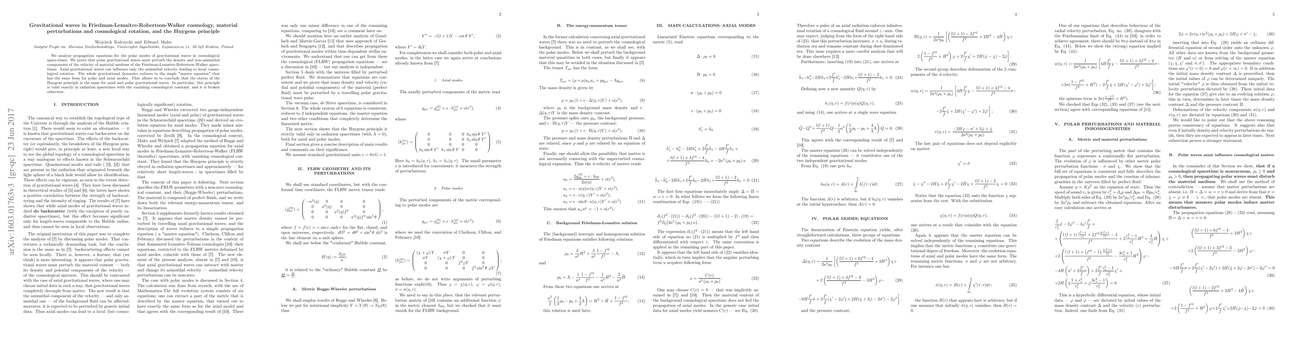 We analyze propagation equations for the polar modes of gravitational waves in cosmological space-times. We prove that polar gravitational waves must perturb the density and non-azimuthal components of the velocity of material medium of the Friedman-Lemaitre-Robertson-Walker spacetimes. Axial gravitational waves can influence only the azimuthal velocity, leading to local cosmological rotation. The whole gravitational dynamics reduces to the single "master equation" that has the same form for polar and axial modes. That allows us to conclude that the status of the Huygens principle is the same for axial and polar gravitational waves. In particular, this principle is valid exactly in radiation spacetimes with the vanishing cosmological constant, and it is broken otherwise.
