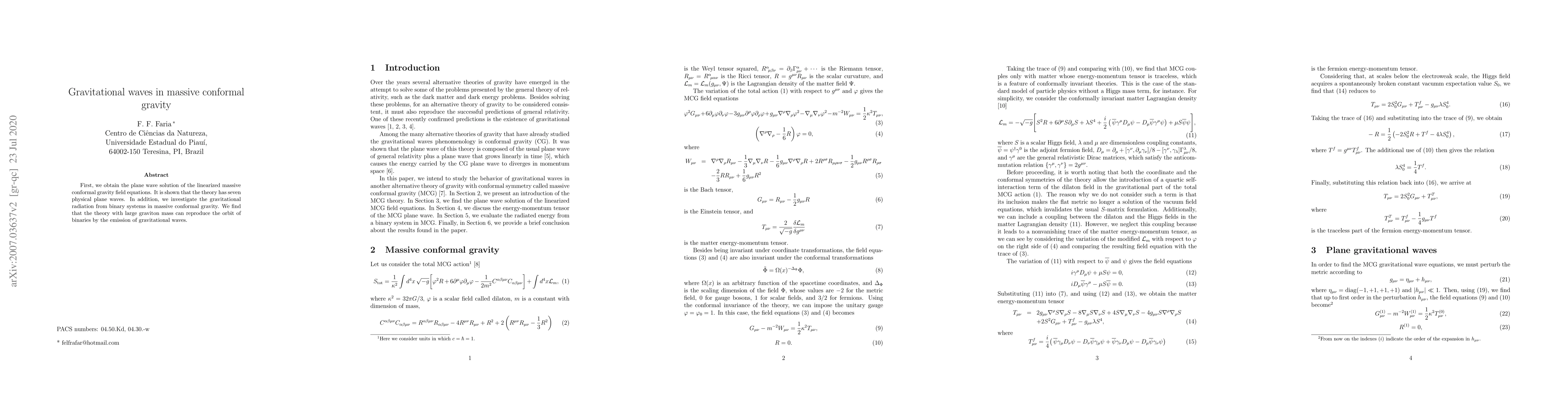 This paper derives the plane wave solution for linearized massive conformal gravity, revealing seven physical plane waves. It also examines gravitational radiation from binary systems, showing that the theory can accurately reproduce binary orbits through gravitational wave emission when the graviton mass is large.