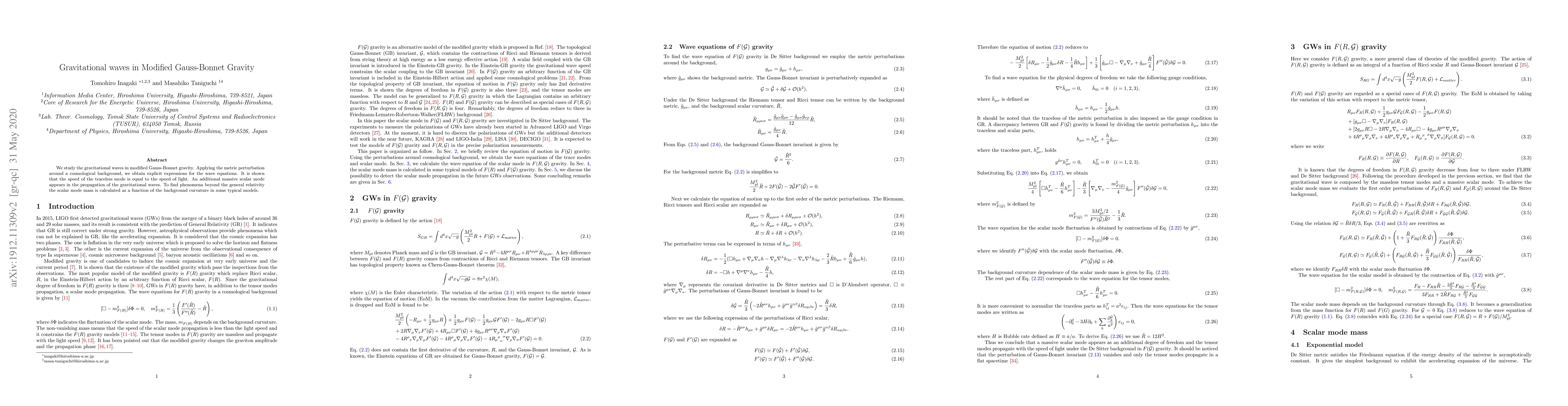 This paper investigates gravitational waves in modified Gauss-Bonnet gravity, revealing that the traceless mode propagates at the speed of light while an additional massive scalar mode emerges. The mass of this scalar mode is computed as a function of background curvature to identify potential deviations from general relativity.