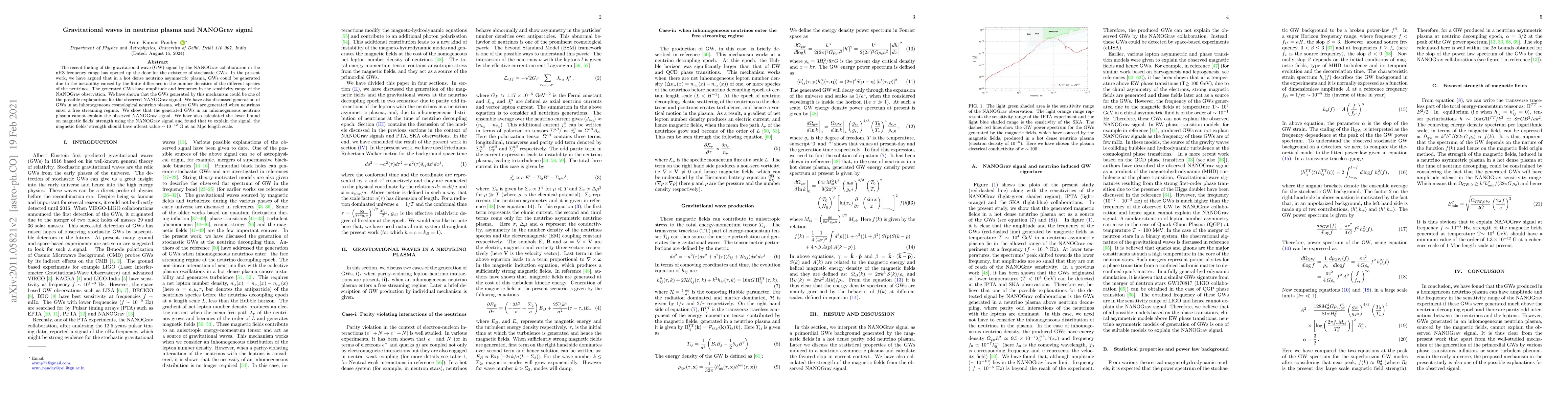 This paper explores the potential generation of gravitational waves (GWs) in hot dense neutrino plasmas due to instabilities from differing neutrino species, suggesting a possible link to the NANOGrav signal. It concludes that while GWs from such plasmas could match the NANOGrav frequency and amplitude, they do not explain the observed signal, and calculates a lower bound on magnetic field strength of $\sim 10^{-12}$ G to account for the signal.
