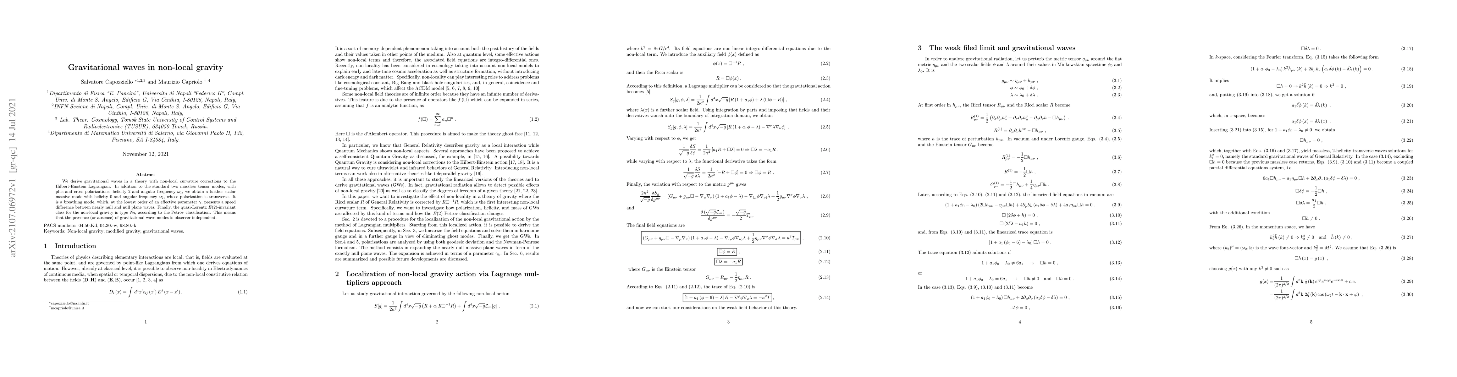 We derive gravitational waves in a theory with non-local curvature corrections to the Hilbert-Einstein Lagrangian. In addition to the standard two massless tensor modes, with plus and cross polarizations, helicity 2 and angular frequency $\omega_{1}$, we obtain a further scalar massive mode with helicity 0 and angular frequency $\omega_{2}$, whose polarization is transverse. It is a breathing mode, which, at the lowest order of an effective parameter $\gamma$, presents a speed difference between nearly null and null plane waves. Finally, the quasi-Lorentz $E(2)$-invariant class for the non-local gravity is type $N_{3}$, according to the Petrov classification. This means that the presence (or absence) of gravitational wave modes is observer-independent.