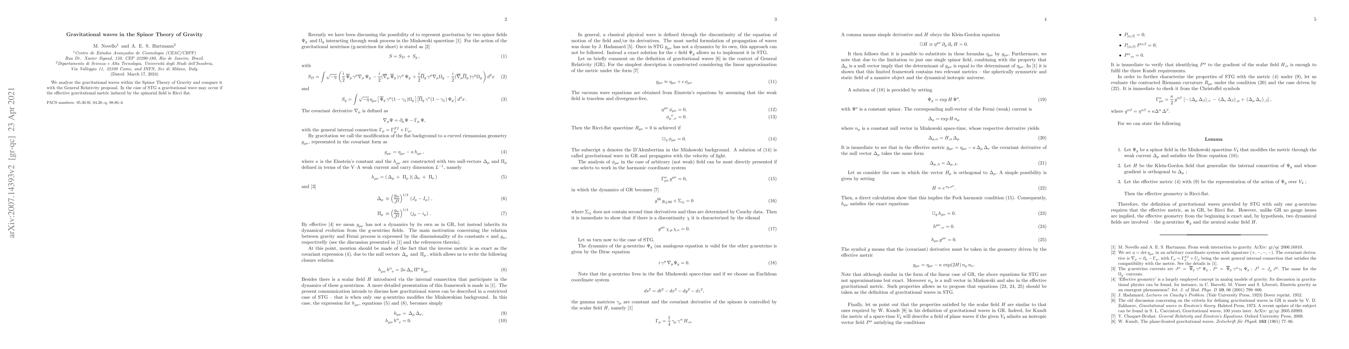 Summary: This paper investigates gravitational waves in the Spinor Theory of Gravity (STG) and contrasts it with General Relativity, finding that STG allows for gravitational waves when the effective gravitational metric induced by the spinorial field is Ricci flat.