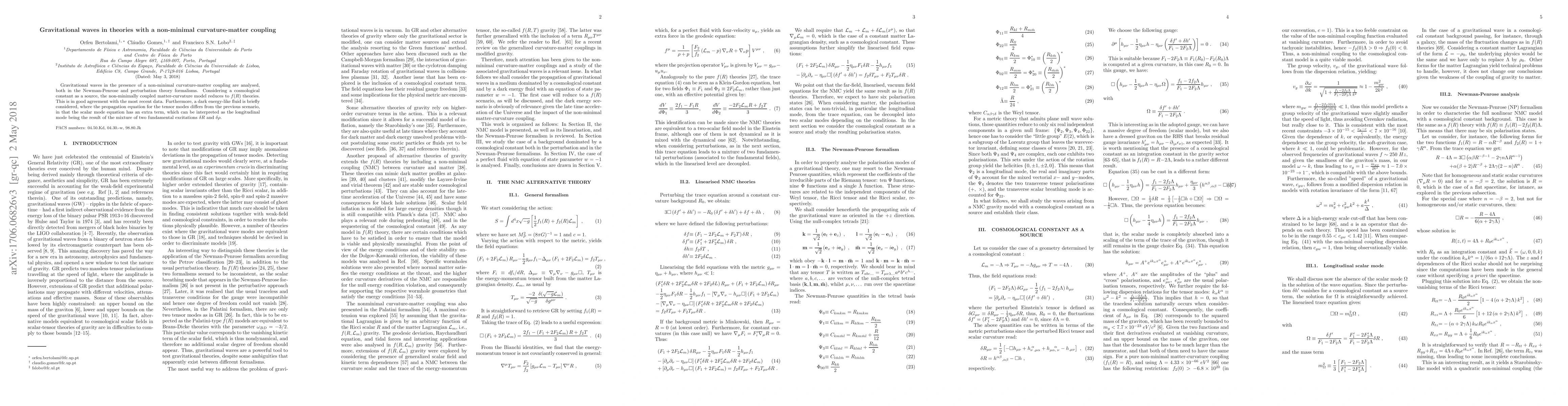 This paper analyzes gravitational waves in theories with non-minimal curvature-matter coupling using both Newman-Penrose and perturbation theory, finding agreement with recent data. It also explores a dark energy-like fluid, where the tensor mode propagation differs due to an additional term in the scalar mode equation, resulting from a mixture of $\delta R$ and $\delta \rho$.