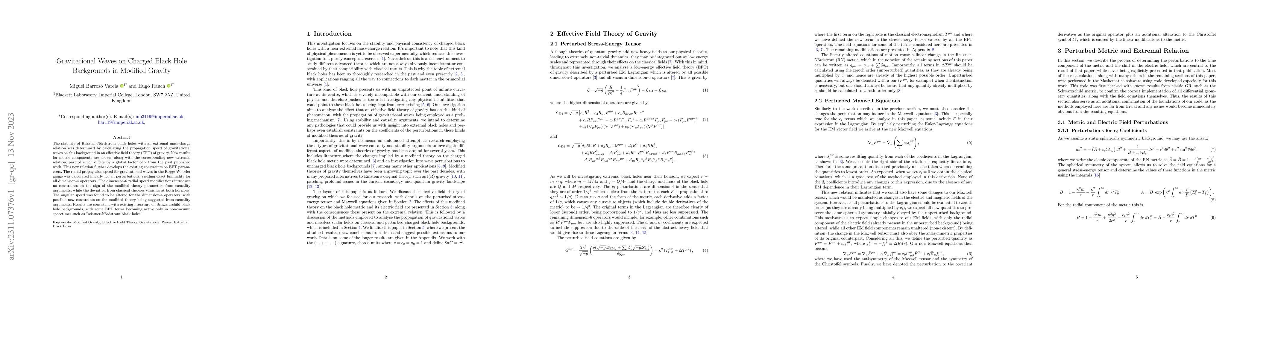 The stability of Reissner-N\"ordstrom black holes with an extremal mass-charge relation was determined by calculating the propagation speed of gravitational waves on this background in an effective field theory (EFT) of gravity. New results for metric components are shown, along with the corresponding new extremal relation, part of which differs by a global factor of 2 from the past published work. This new relation further develops the existing constraints on EFT parameters. The radial propagation speed for gravitational waves in the Regge-Wheeler gauge was calculated linearly for all perturbations, yielding exact luminality for all dimension-4 operators. The dimension-6 radial speed modifications introduce no constraints on the sign of the modified theory parameters from causality arguments, while the deviation from classical theories vanishes at both horizons. The angular speed was found to be altered for the dimension-4 operators, with possible new constraints on the modified theory being suggested from causality arguments. Results are consistent existing literature on Schwarzschild black hole backgrounds, with some EFT terms becoming active only in non-vacuum spacetimes such as Reissner-N\"ordstrom black holes.