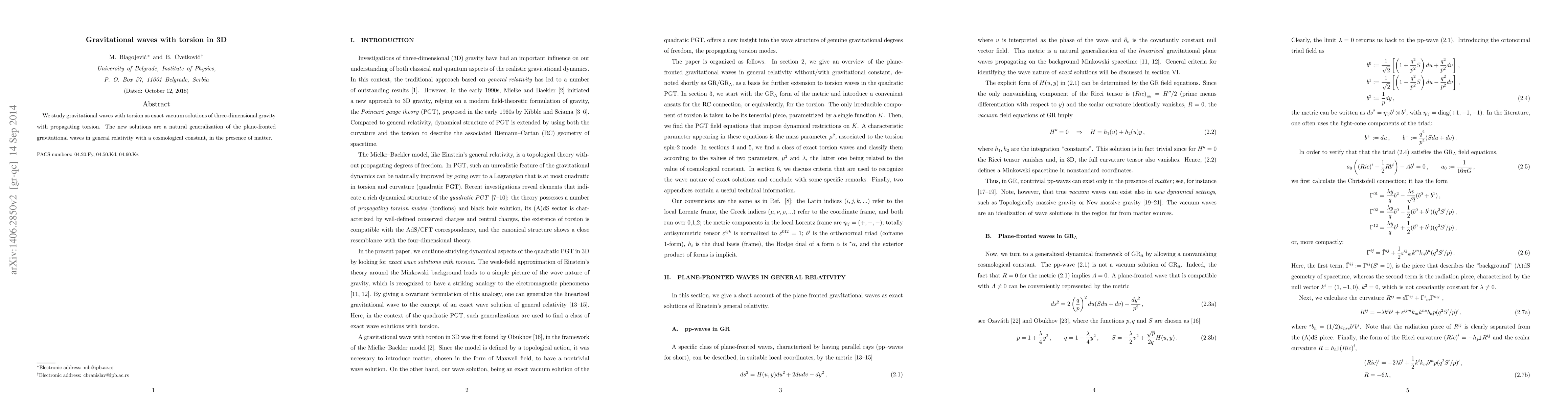 This paper explores gravitational waves in three-dimensional gravity that incorporate torsion, presenting exact vacuum solutions. The new solutions extend the concept of plane-fronted gravitational waves from general relativity to include torsion effects.