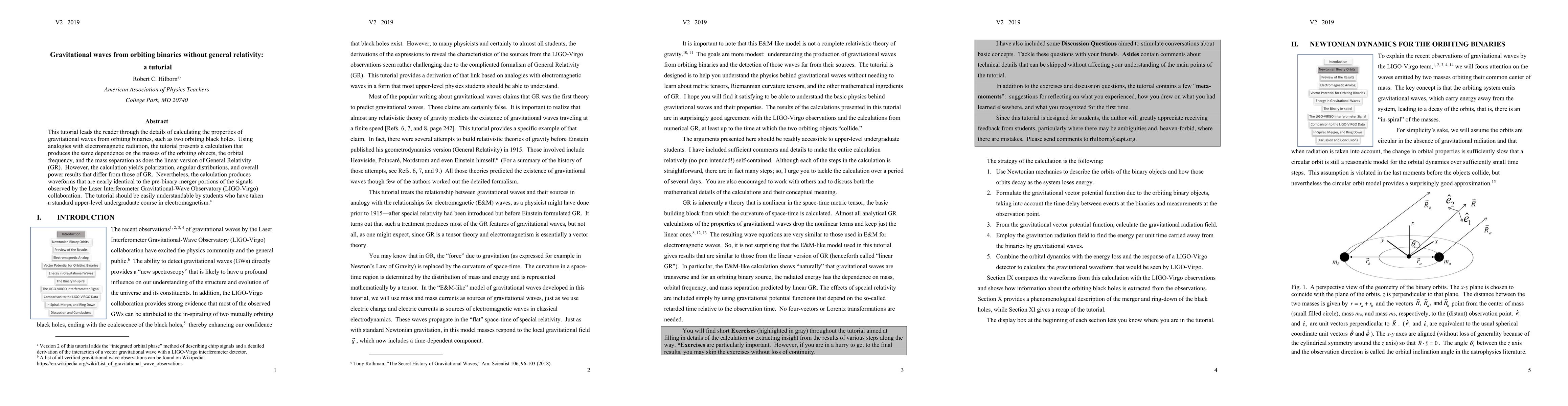 The paper presents a tutorial on calculating gravitational wave properties from orbiting binaries without relying on General Relativity (GR), using electromagnetic (E&M) analogies. It derives waveform expressions and compares them with LIGO-Virgo observations.