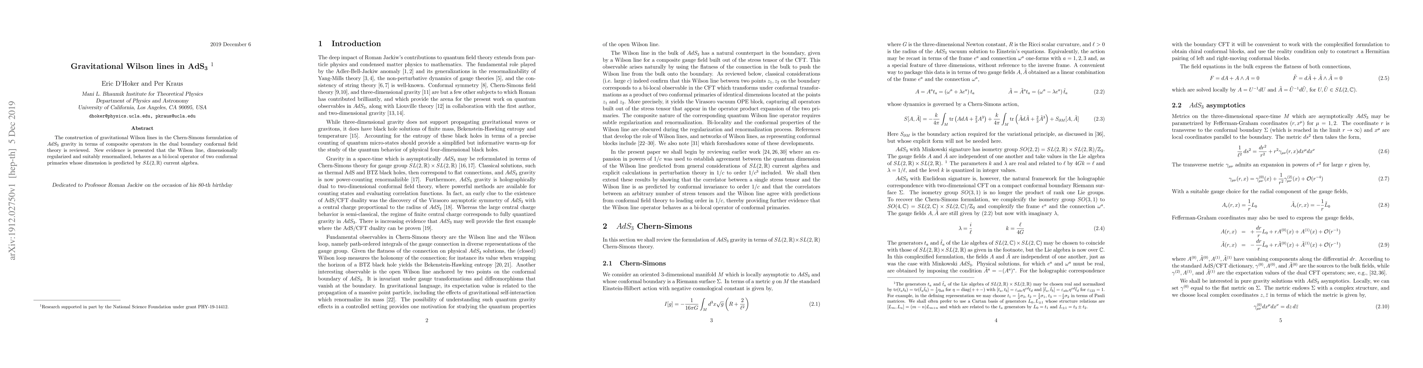 The construction of gravitational Wilson lines in the Chern-Simons formulation of $AdS_3$ gravity in terms of composite operators in the dual boundary conformal field theory is reviewed. New evidence is presented that the Wilson line, dimensionally regularized and suitably renormalized, behaves as a bi-local operator of two conformal primaries whose dimension is predicted by SL(2,R) current algebra.