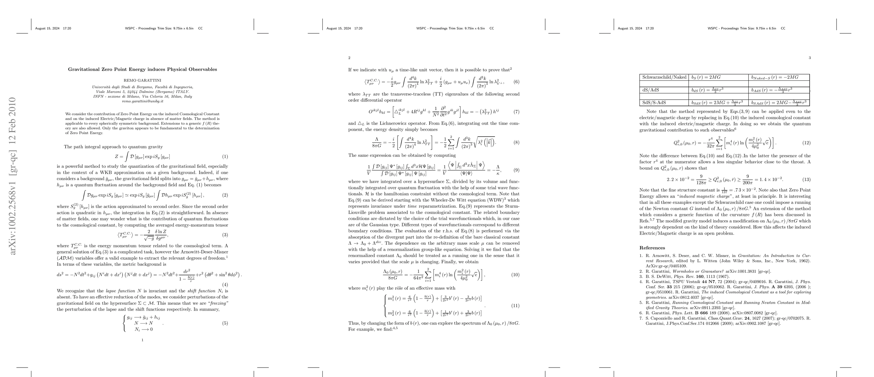 We consider the contribution of Zero Point Energy on the induced Cosmological Constant and on the induced Electric/Magnetic charge in absence of matter fields. The method is applicable to every spherically symmetric background. Extensions to a generic $f(R) $ theory are also allowed. Only the graviton appears to be fundamental to the determination of Zero Point Energy.