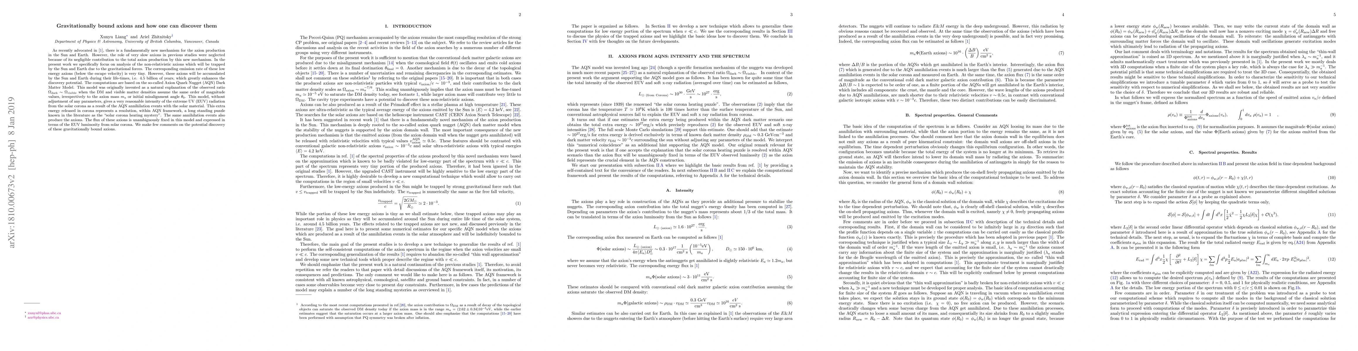 As recently advocated in \cite{Fischer:2018niu}, there is a fundamentally new mechanism for the axion production in the Sun and Earth. However, the role of very slow axions in previous studies were neglected because of its negligible contribution to the total axion production by this new mechanism. In the present work we specifically focus on analysis of the non-relativistic axions which will be trapped by the Sun and Earth due to the gravitational forces. The corresponding emission rate of these low energy axions (below the escape velocity) is very tiny. However, these axions will be accumulated by the Sun and Earth during their life-times, i.e. 4.5 billion of years, which greatly enhances the discovery potential. The computations are based on the so-called Axion Quark Nugget (AQN) Dark Matter Model. This model was originally invented as a natural explanation of the observed ratio $\Omega_{\rm dark} \sim \Omega_{\rm visible}$ when the DM and visible matter densities assume the same order of magnitude values, irrespectively to the axion mass $m_a$ or initial misalignment angle $\theta_0$.This model, without adjustment of any parameters, gives a very reasonable intensity of the extreme UV (EUV) radiation from the solar corona as a result of the AQN annihilation events with the solar material. This extra energy released in corona represents a resolution, within AQN framework, a long standing puzzle known in the literature as the "solar corona heating mystery". The same annihilation events also produce the axions. The flux of these axions is unambiguously fixed in this model and expressed in terms of the EUV luminosity from solar corona. We make few comments on the potential discovery of these gravitationally bound axions.
