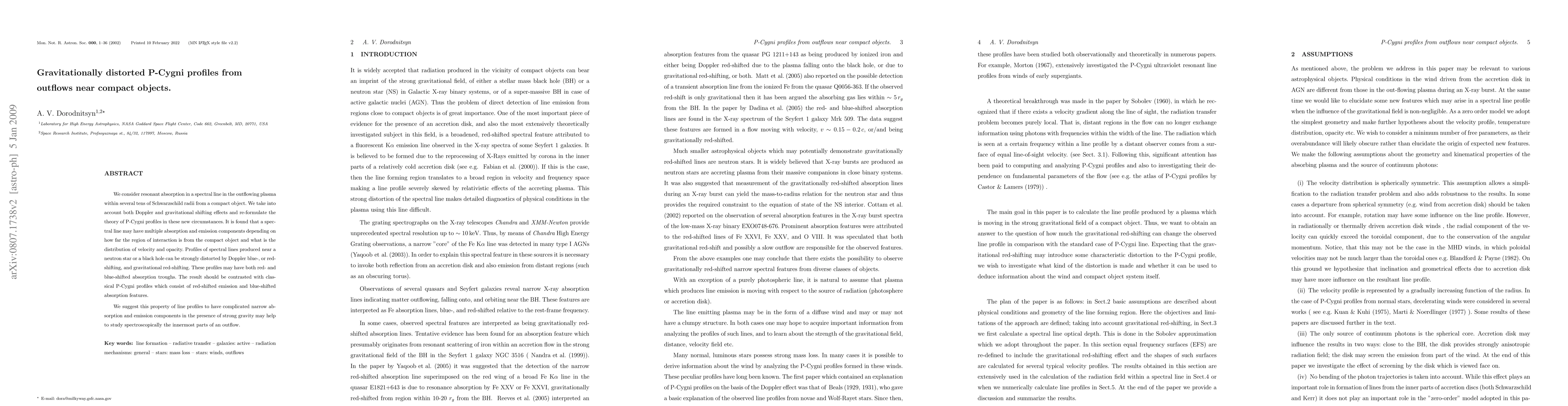 We consider resonant absorption in a spectral line in the outflowing plasma within several tens of Schwarzschild radii from a compact object. We take into account both Doppler and gravitational shifting effects and re-formulate the theory of P-Cygni profiles in these new circumstances. It is found that a spectral line may have multiple absorption and emission components depending on how far the region of interaction is from the compact object and what is the distribution of velocity and opacity. Profiles of spectral lines produced near a neutron star or a black hole can be strongly distorted by Doppler blue-, or red-shifting, and gravitational red-shifting. These profiles may have both red- and blue-shifted absorption troughs. The result should be contrasted with classical P-Cygni profiles which consist of red-shifted emission and blue-shifted absorption features. We suggest this property of line profiles to have complicated narrow absorption and emission components in the presence of strong gravity may help to study spectroscopically the innermost parts of an outflow.