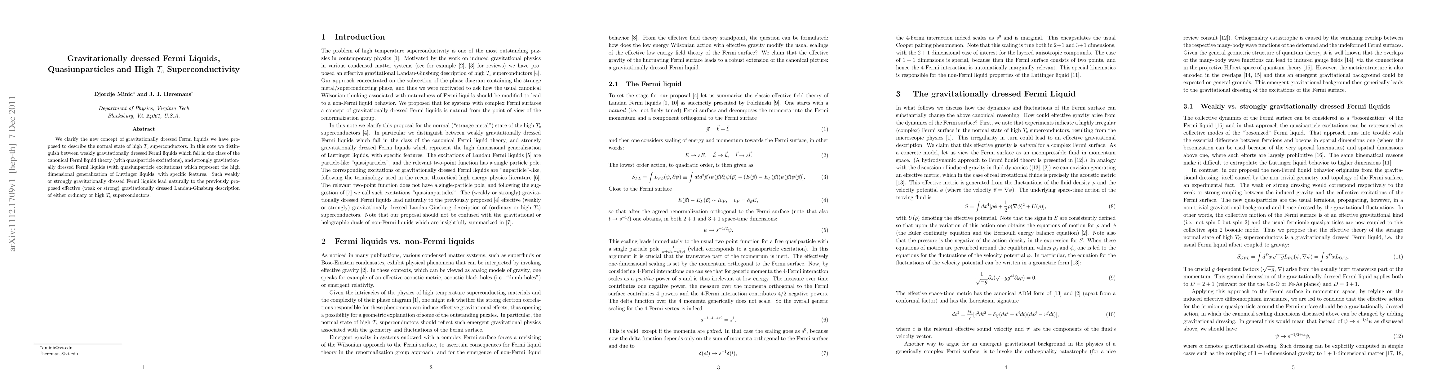 We clarify the new concept of gravitationally dressed Fermi liquids we have proposed to describe the normal state of high Tc superconductors. In this note we distinguish between weakly gravitationally dressed Fermi liquids which fall in the class of the canonical Fermi liquid theory (with quasiparticle excitations), and strongly gravitationally dressed Fermi liquids (with quasiunparticle excitations) which represent the high dimensional generalization of Luttinger liquids, with specific features. Such weakly or strongly gravitationally dressed Fermi liquids lead naturally to the previously proposed effective (weak or strong) gravitationally dressed Landau-Ginsburg description of either ordinary or high Tc superconductors.
