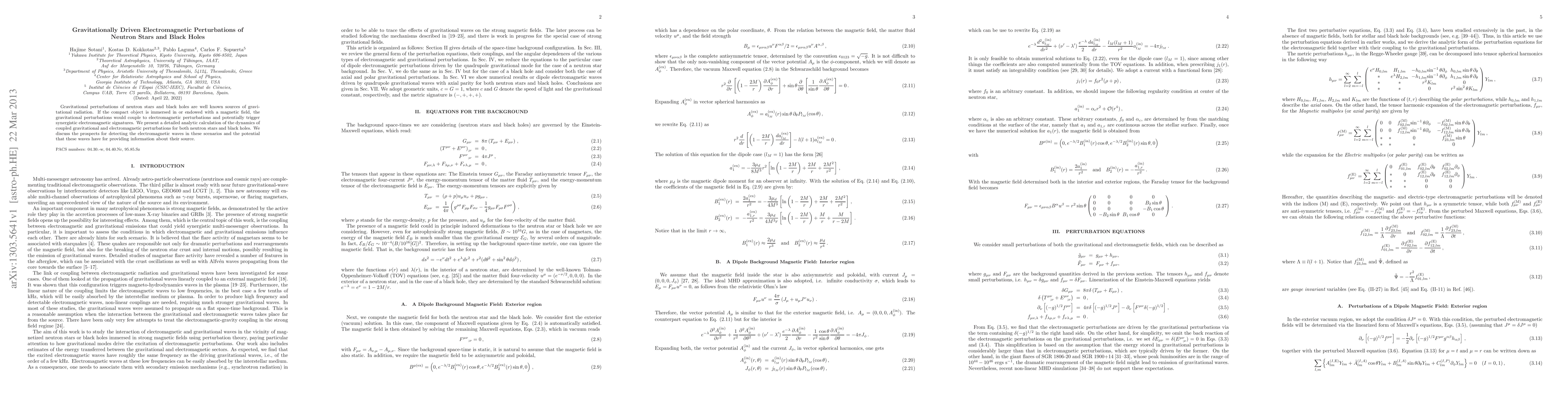 This paper investigates the coupling between gravitational and electromagnetic perturbations in neutron stars and black holes, presenting an analytic calculation of the dynamics of these interactions. It explores the potential for detecting electromagnetic waves from such phenomena and their implications for understanding the source objects.