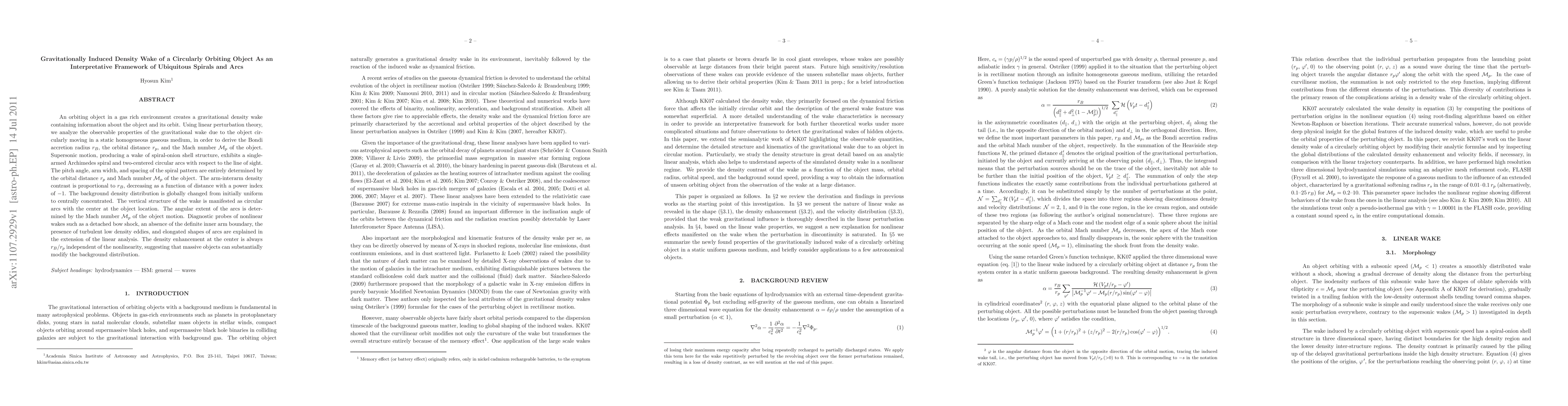 An orbiting object in a gas rich environment creates a gravitational density wake containing information about the object and its orbit. Using linear perturbation theory, we analyze the observable properties of the gravitational wake due to the object circularly moving in a static homogeneous gaseous medium, in order to derive the Bondi accretion radius $r_B$, the orbital distance $r_p$, and the Mach number of the object. Supersonic motion, producing a wake of spiral-onion shell structure, exhibits a single-armed Archimedes spiral and two-centered circular arcs with respect to the line of sight. The pitch angle, arm width, and spacing of the spiral pattern are entirely determined by the orbital distance $r_p$ and Mach number of the object. The arm-interarm density contrast is proportional to the Bondi accretion radius, decreasing as a function of distance with a power index of -1. The background density distribution is globally changed from initially uniform to centrally concentrated. The vertical structure of the wake is manifested as circular arcs with the center at the object location. The angular extent of the arcs is determined by the Mach number of the object motion. Diagnostic probes of nonlinear wakes such as a detached bow shock, an absence of the definite inner arm boundary, the presence of turbulent low density eddies, and elongated shapes of arcs are explained in the extension of the linear analysis. The density enhancement at the center is always $r_B/r_p$ independent of the nonlinearity, suggesting that massive objects can substantially modify the background distribution. These detailed understanding of the wake characteristics will provide an interpretative framework for both further theoretical works under more complicated situations and future observations to detect the gravitational wakes of hidden objects.