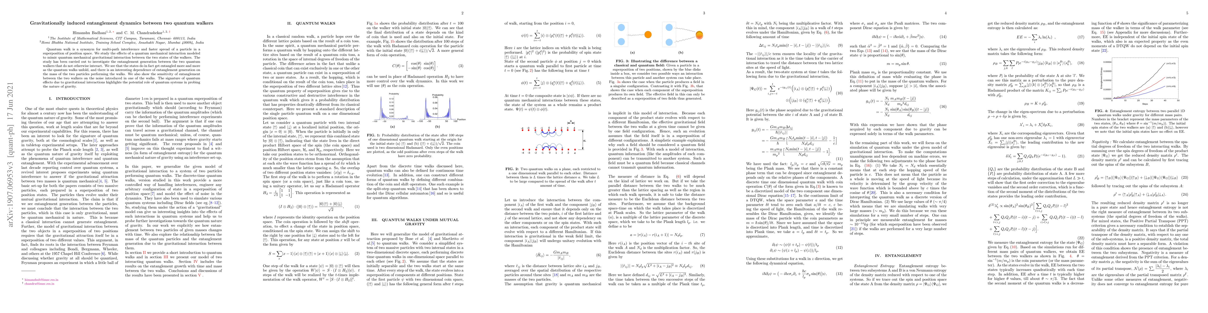 Quantum walk is a synonym for multi-path interference and faster spread of a particle in a superposition of position space. We study the effects of a quantum mechanical interaction modeled to mimic quantum mechanical gravitational interaction between the two states of the walkers. The study has been carried out to investigate the entanglement generation between the two quantum walkers that do not otherwise interact. We see that the states do in fact get entangled more and more as the quantum walks unfold, and there is an interesting dependence of entanglement generation on the mass of the two particles performing the walks. We also show the sensitivity of entanglement between the two walkers on the noise introduced in one of the walks. The signature of quantum effects due to gravitational interactions highlights the potential role of quantum systems in probing the nature of gravity.