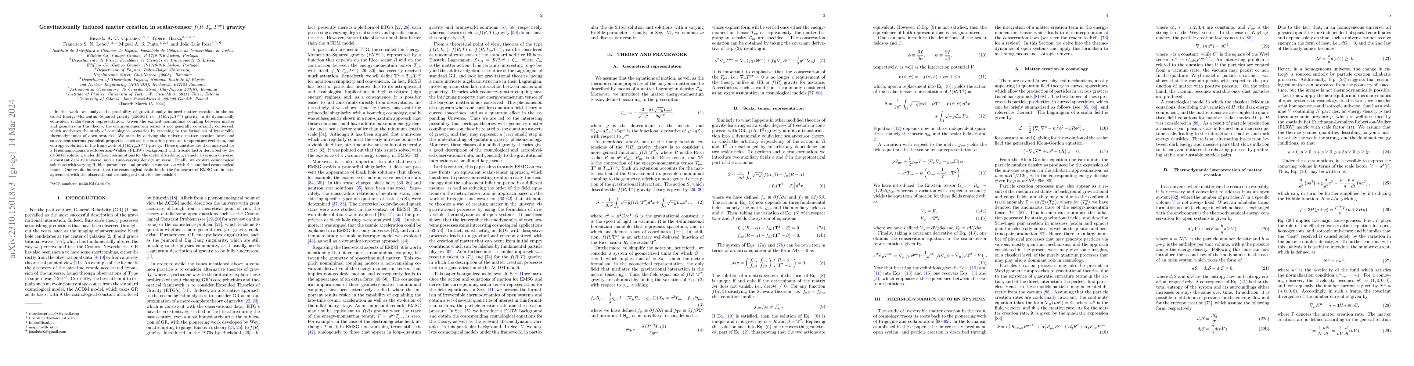 This paper explores gravitationally induced matter creation in $f(R,T_{\mu\nu}T^{\mu\nu})$ gravity, deriving matter creation rates and thermodynamic properties for different cosmological scenarios, and finds that EMSG models align well with low-redshift observational data.