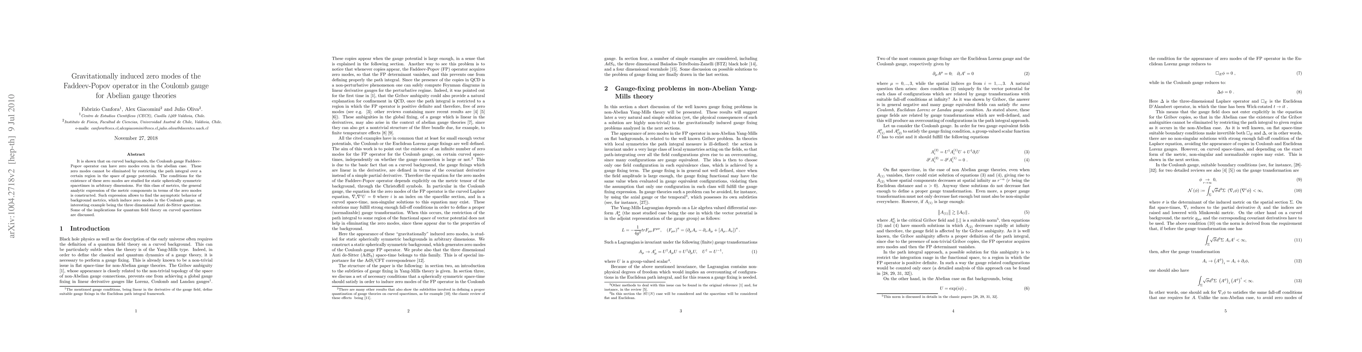 The paper demonstrates the existence of zero modes in the Coulomb gauge Faddeev-Popov operator on curved backgrounds for Abelian gauge theories, with a focus on static spherically symmetric spacetimes. These zero modes' implications for quantum field theory on curved spacetimes are also discussed.