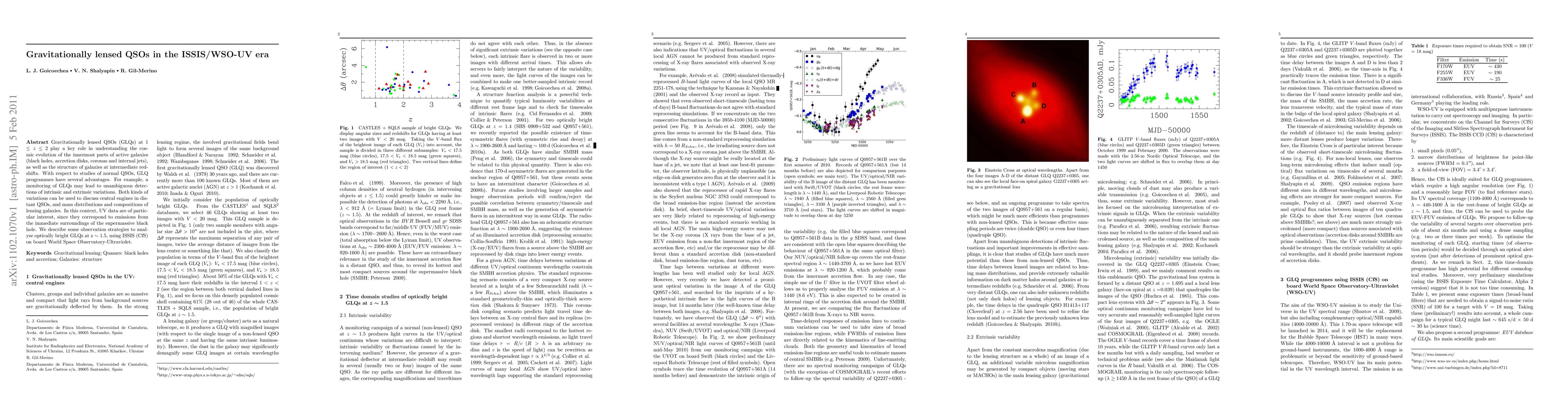 Gravitationally lensed QSOs (GLQs) at redshift z = 1-2 play a key role in understanding the cosmic evolution of the innermost parts of active galaxies (black holes, accretion disks, coronas and internal jets), as well as the structure of galaxies at intermediate redshifts. With respect to studies of normal QSOs, GLQ programmes have several advantages. For example, a monitoring of GLQs may lead to unambiguous detections of intrinsic and extrinsic variations. Both kinds of variations can be used to discuss central engines in distant QSOs, and mass distributions and compositions of lensing galaxies. In this context, UV data are of particular interest, since they correspond to emissions from the immediate surroundings of the supermassive black hole. We describe some observation strategies to analyse optically bright GLQs at z of about 1.5, using ISSIS (CfS) on board World Space Observatory-Ultraviolet.