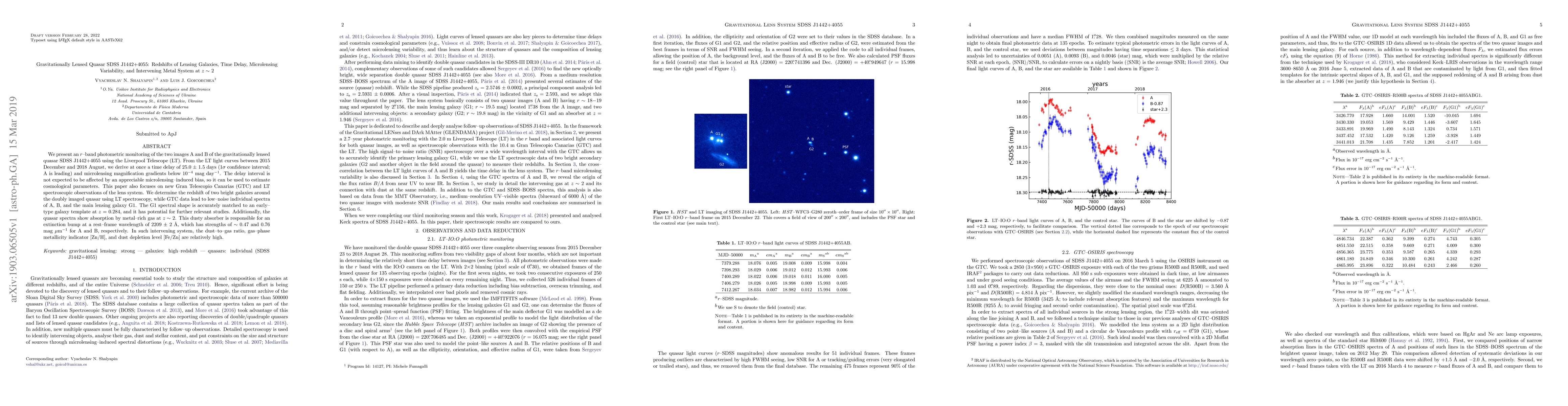 This paper reports on the $r$-band photometric monitoring of the gravitationally lensed quasar SDSS J1442+4055, deriving a time delay of 25.0 $\pm$ 1.5 days and negligible microlensing variability. Spectroscopic observations reveal the redshift of the lensing galaxy G1 at $z$ = 0.284 and a metal-rich intervening system at $z \sim$ 2 with high dust-to-gas ratio and gas-phase metallicity.