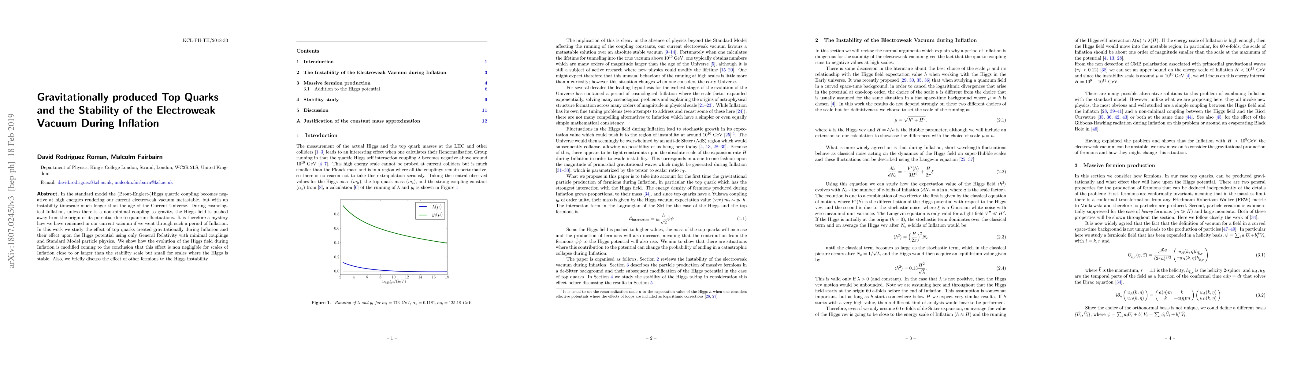 In the standard model the (Brout-Englert-)Higgs quartic coupling becomes negative at high energies rendering our current electroweak vacuum metastable, but with an instability timescale much longer than the age of the Current Universe. During cosmological Inflation, unless there is a non-minimal coupling to gravity, the Higgs field is pushed away from the origin of its potential due to quantum fluctuations. It is therefore a mystery how we have remained in our current vacuum if we went through such a period of Inflation. In this work we study the effect of top quarks created gravitationally during Inflation and their effect upon the Higgs potential using only General Relativity with minimal couplings and Standard Model particle physics. We show how the evolution of the Higgs field during Inflation is modified coming to the conclusion that this effect is non negligible for scales of Inflation close to or larger than the stability scale but small for scales where the Higgs is stable. Also, we briefly discuss the effect of other fermions to the Higgs instability.