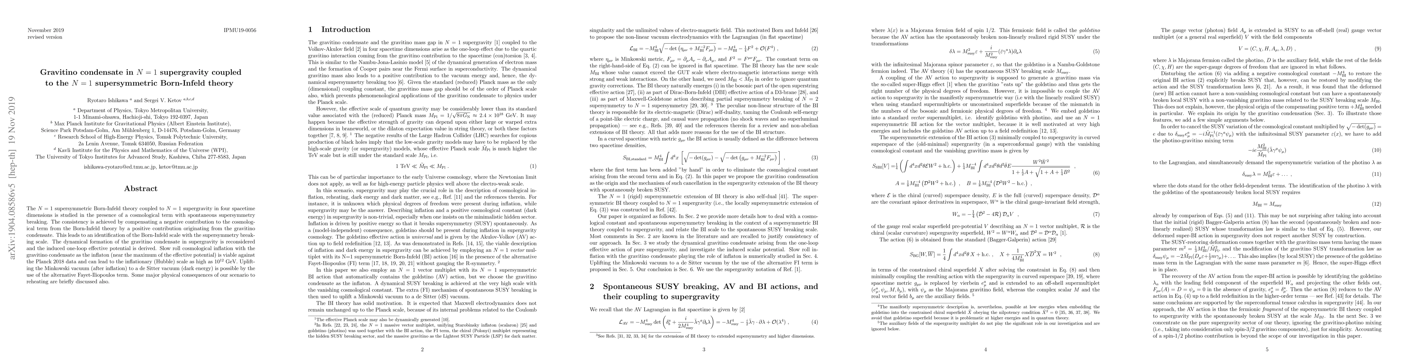 The $N=1$ supersymmetric Born-Infeld theory coupled to $N=1$ supergravity in four spacetime dimensions is studied in the presence of a cosmological term with spontaneous supersymmetry breaking. The consistency is achieved by compensating a negative contribution to the cosmological term from the Born-Infeld theory by a positive contribution originating from the gravitino condensate. This leads to an identification of the Born-Infeld scale with the supersymmetry breaking scale. The dynamical formation of the gravitino condensate in supergravity is reconsidered and the induced one-loop effective potential is derived. Slow roll cosmological inflation with the gravitino condensate as the inflaton (near the maximum of the effective potential) is viable against the Planck 2018 data and can lead to the inflationary (Hubble) scale as high as $10^{12}$ GeV. Uplifting the Minkowski vacuum (after inflation) to a de Sitter vacuum (dark energy) is possible by the use of the alternative Fayet-Iliopoulos term. Some major physical consequences of our scenario to reheating are briefly discussed also.