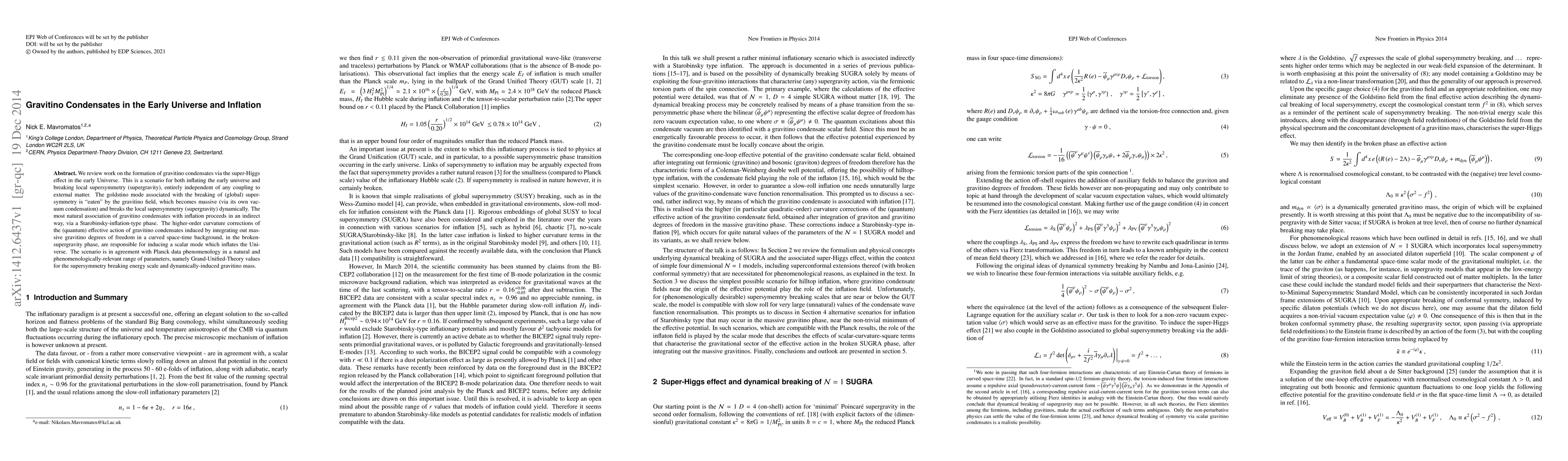 This paper reviews the formation of gravitino condensates in the early Universe through the super-Higgs effect, leading to inflation and breaking local supersymmetry. The gravitino field, becoming massive via its own vacuum condensation, induces a scalar mode that drives inflation, aligning with Planck data in a natural parameter range.