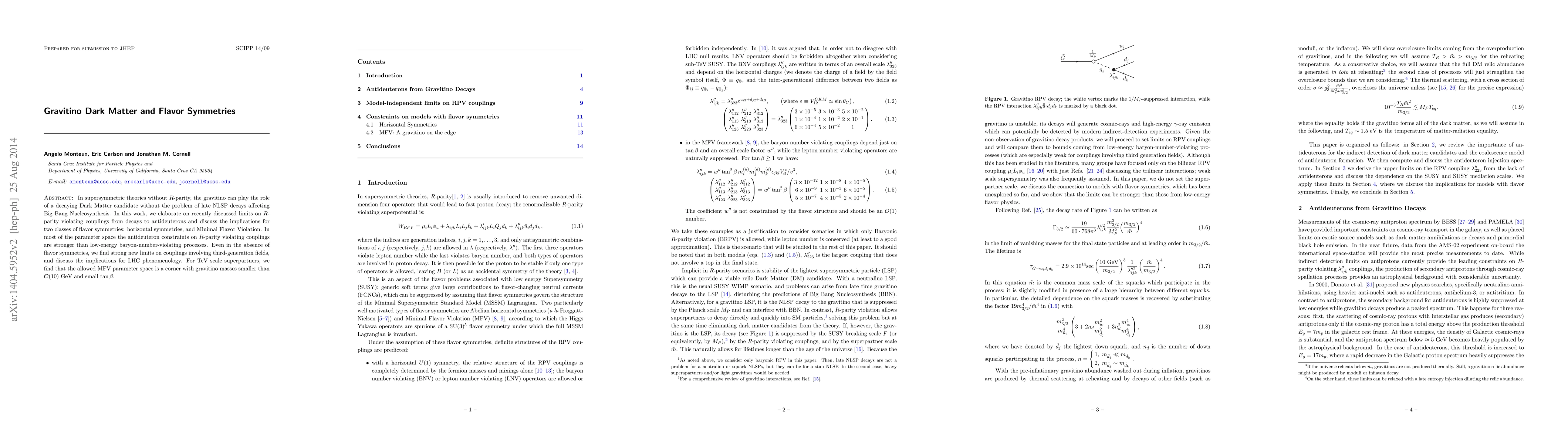 This paper explores gravitino dark matter in supersymmetric theories without R-parity, focusing on its decay and implications for flavor symmetries. It finds that antideuteron constraints often surpass those from low-energy baryon-number-violating processes, leading to strong new limits on third-generation couplings and constrained MFV parameter space for TeV scale superpartners.