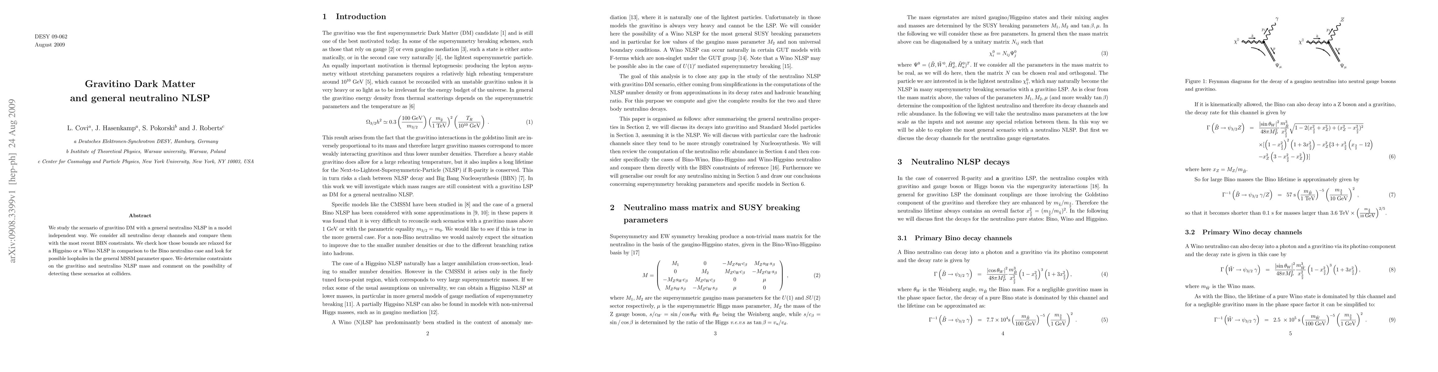 We study the scenario of gravitino DM with a general neutralino NLSP in a model independent way. We consider all neutralino decay channels and compare them with the most recent BBN constraints. We check how those bounds are relaxed for a Higgsino or a Wino NLSP in comparison to the Bino neutralino case and look for possible loopholes in the general MSSM parameter space.We determine constraints on the gravitino and neutralino NLSP mass and comment on the possibility of detecting these scenarios at colliders.
