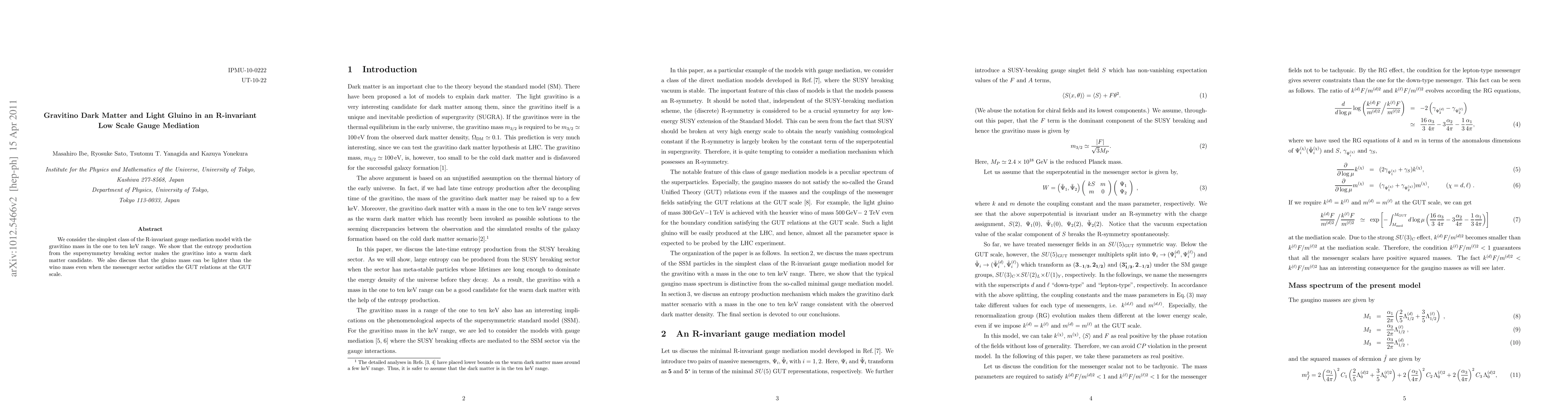 This paper explores an R-invariant gauge mediation model where gravitinos in the 1-10 keV range serve as warm dark matter candidates due to entropy production from supersymmetry breaking. It also demonstrates that the gluino can be lighter than the wino despite messenger sector constraints aligning with GUT relations.
