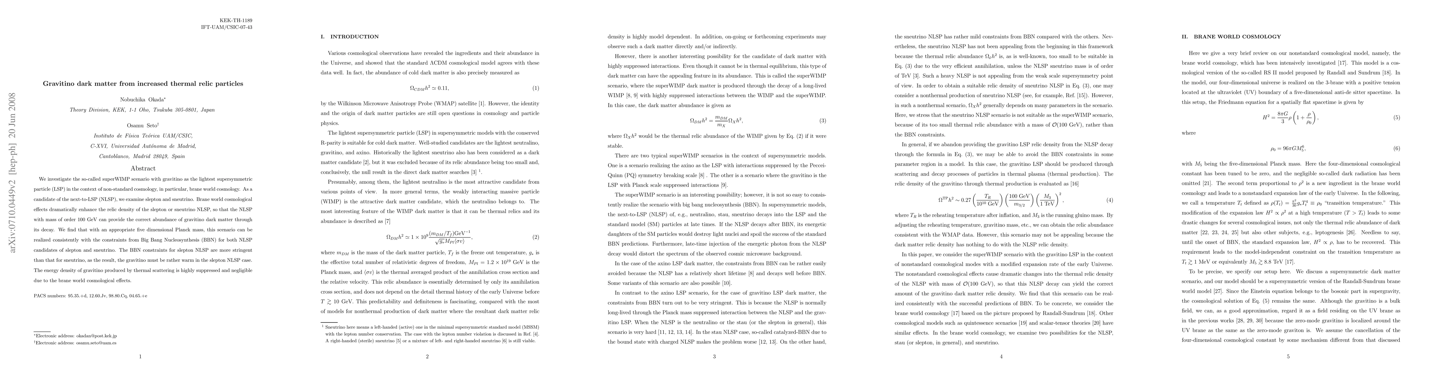 We investigate the so-called superWIMP scenario with gravitino as the lightest supersymmetric particle (LSP) in the context of non-standard cosmology, in particular, brane world cosmology. As a candidate of the next-to-LSP (NLSP), we examine slepton and sneutrino. Brane world cosmological effects dramatically enhance the relic density of the slepton or sneutrino NLSP, so that the NLSP with mass of order 100 GeV can provide the correct abundance of gravitino dark matter through its decay. We find that with an appropriate five dimensional Planck mass, this scenario can be realized consistently with the constraints from Big Bang Nucleosynthesis (BBN) for both NLSP candidates of slepton and sneutrino. The BBN constraints for slepton NLSP are more stringent than that for sneutrino, as the result, the gravitino must be rather warm in the slepton NLSP case. The energy density of gravitino produced by thermal scattering is highly suppressed and negligible due to the brane world cosmological effects.