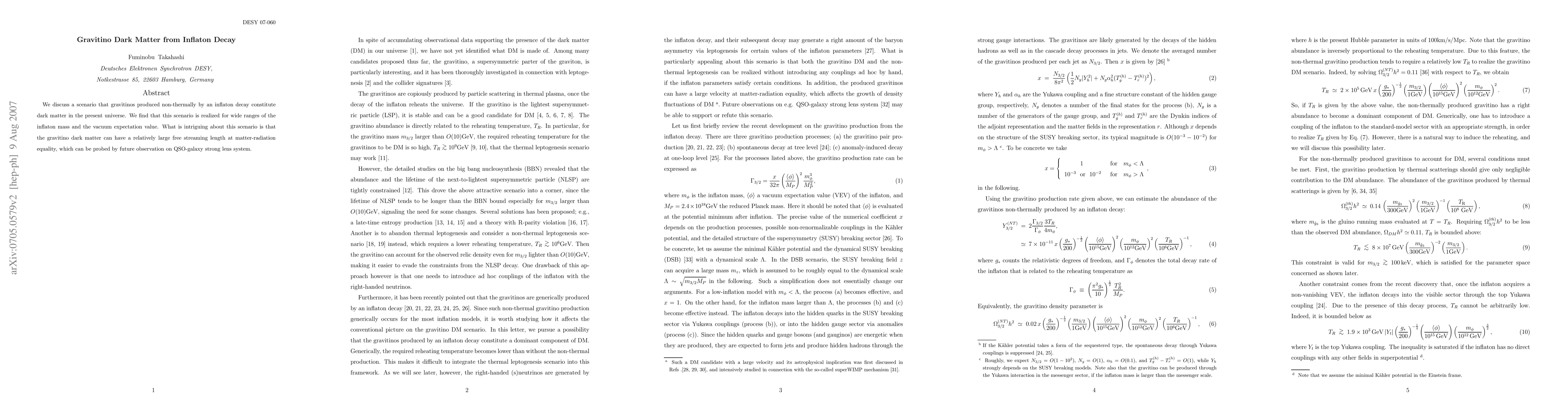 This paper explores the possibility of gravitinos, produced non-thermally from inflaton decay, constituting dark matter. The study finds this scenario feasible across a broad range of inflaton masses and vacuum expectation values, with potential observational implications for future studies on QSO-galaxy strong lens systems.