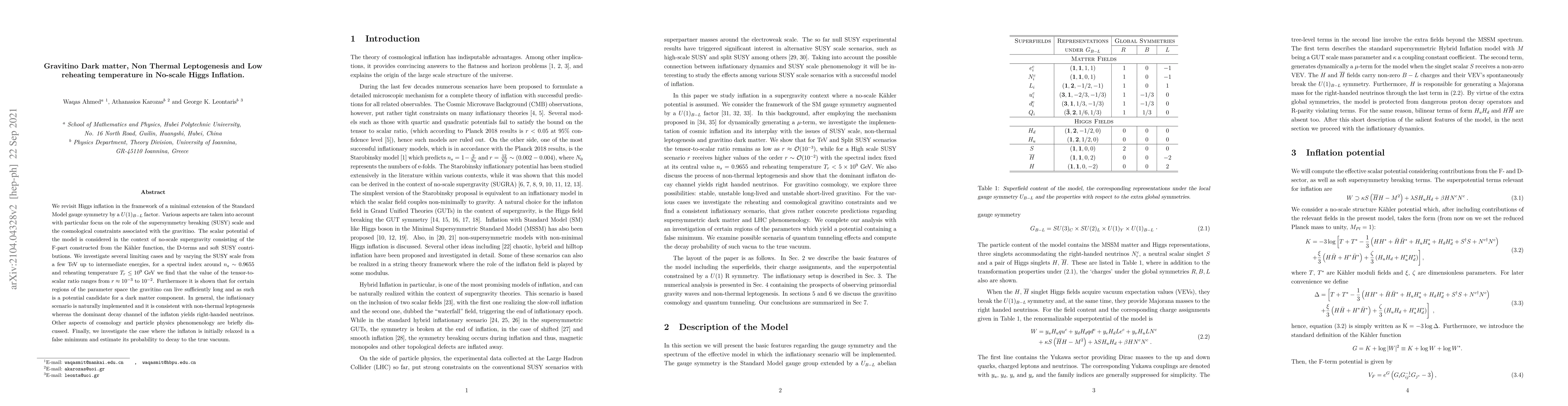 This paper explores Higgs inflation within a $U(1)_{B-L}$ extended Standard Model, focusing on gravitino dark matter and low reheating temperatures. It finds that the gravitino can serve as dark matter under certain conditions, and the inflationary model is consistent with non-thermal leptogenesis and low reheating temperatures.
