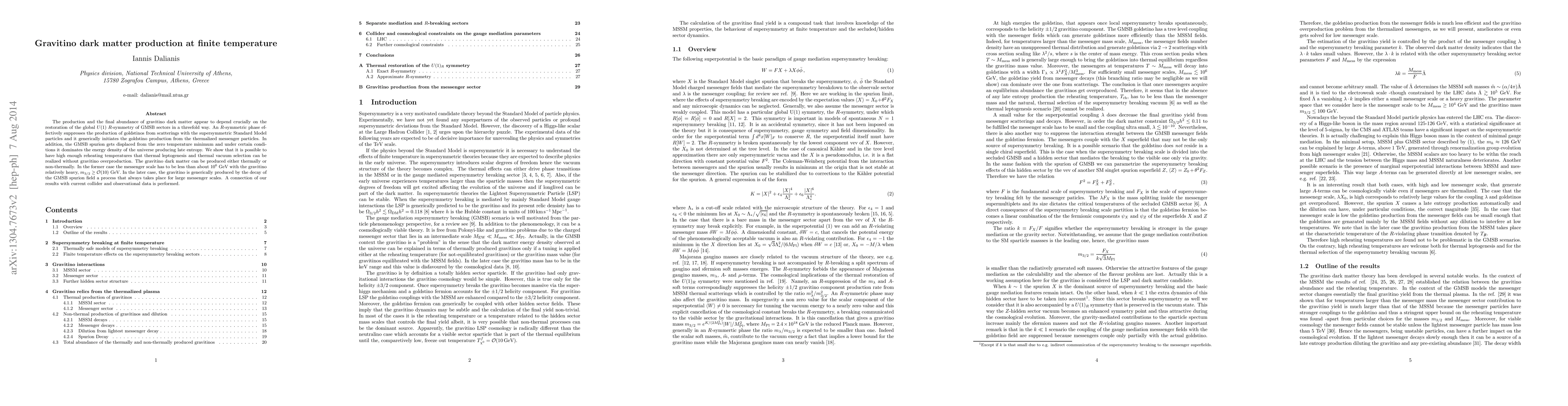 This paper investigates the production mechanisms and abundance of gravitino dark matter in the context of gauge-mediated supersymmetry breaking (GMSB) at finite temperatures. It finds that gravitino production can occur thermally or non-thermally, depending on the messenger scale and the displacement of the GMSB spurion field, with implications for collider and observational data.