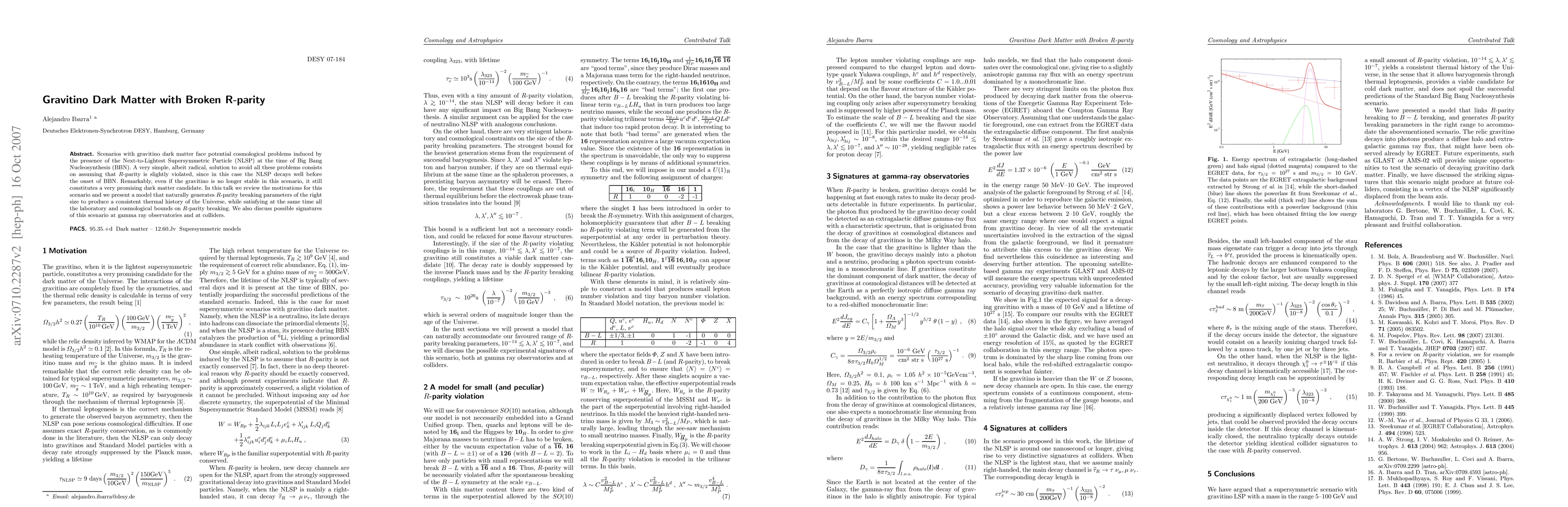 This paper explores the viability of gravitino dark matter in scenarios where R-parity is slightly broken, allowing the Next-to-Lightest Supersymmetric Particle to decay before Big Bang Nucleosynthesis, thus resolving cosmological issues. It presents a model that generates appropriate R-parity breaking parameters and discusses potential observational signatures.