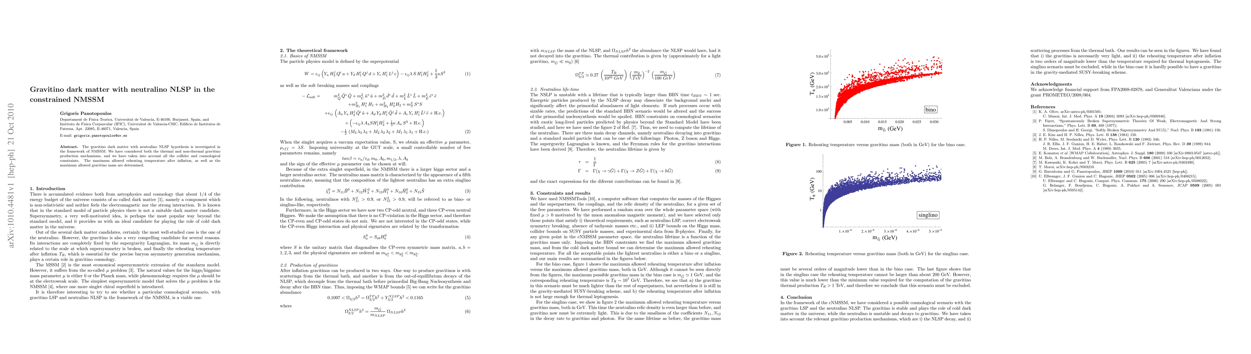 This paper explores gravitino dark matter with a neutralino as the next-to-lightest supersymmetric particle (NLSP) in the constrained Next-to-Minimal Supersymmetric Standard Model (NMSSM), considering both thermal and non-thermal production mechanisms, and analyzing collider and cosmological constraints to determine the maximum allowed gravitino mass and reheating temperature post-inflation.