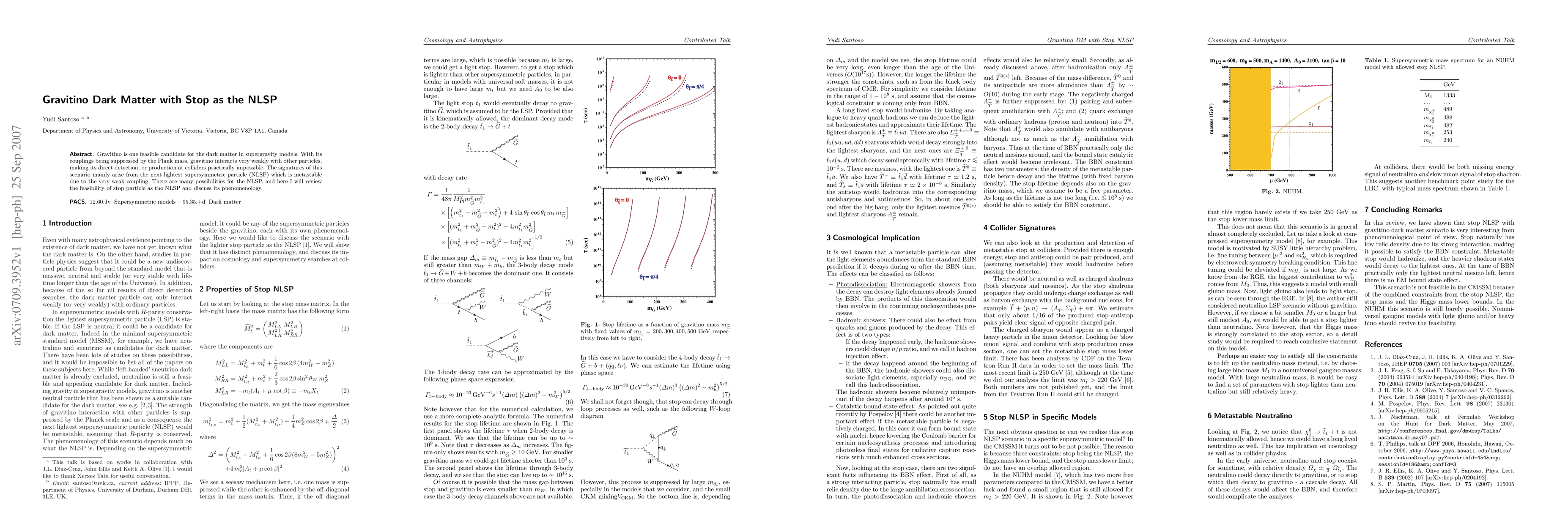 This paper explores gravitino as a dark matter candidate in supergravity models, focusing on the stop as the next lightest supersymmetric particle (NLSP). It discusses the implications and phenomenology of this scenario, highlighting the challenges in detecting such weakly interacting particles.