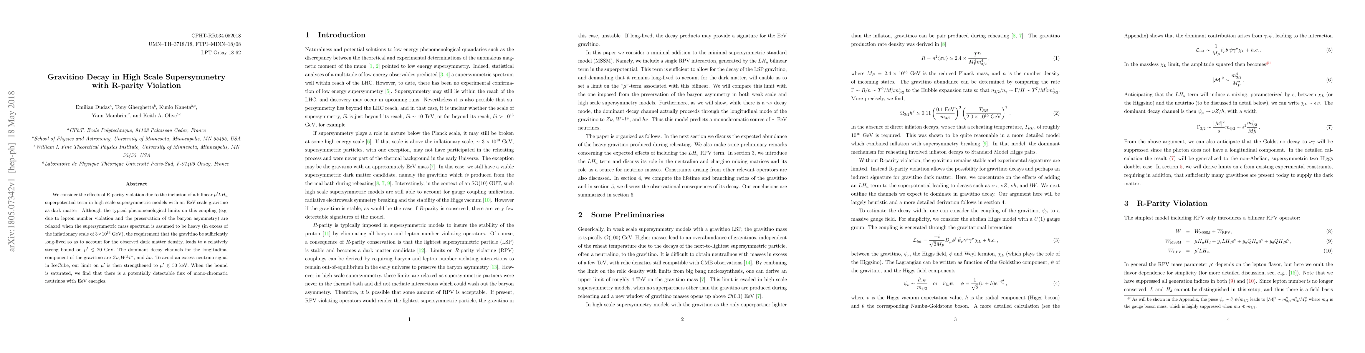 We consider the effects of R-parity violation due to the inclusion of a bilinear $\mu^\prime L H_u$ superpotential term in high scale supersymmetric models with an EeV scale gravitino as dark matter. Although the typical phenomenological limits on this coupling (e.g. due to lepton number violation and the preservation of the baryon asymmetry) are relaxed when the supersymmetric mass spectrum is assumed to be heavy (in excess of the inflationary scale of $3 \times 10^{13}$ GeV), the requirement that the gravitino be sufficiently long-lived so as to account for the observed dark matter density, leads to a relatively strong bound on $\mu^\prime \lesssim 20$ GeV. The dominant decay channels for the longitudinal component of the gravitino are $Z \nu, W^\pm l^\mp$, and $h\nu$. To avoid an excess neutrino signal in IceCube, our limit on $\mu'$ is then strengthened to $\mu' \lesssim 50$ keV. When the bound is saturated, we find that there is a potentially detectable flux of mono-chromatic neutrinos with EeV energies.
