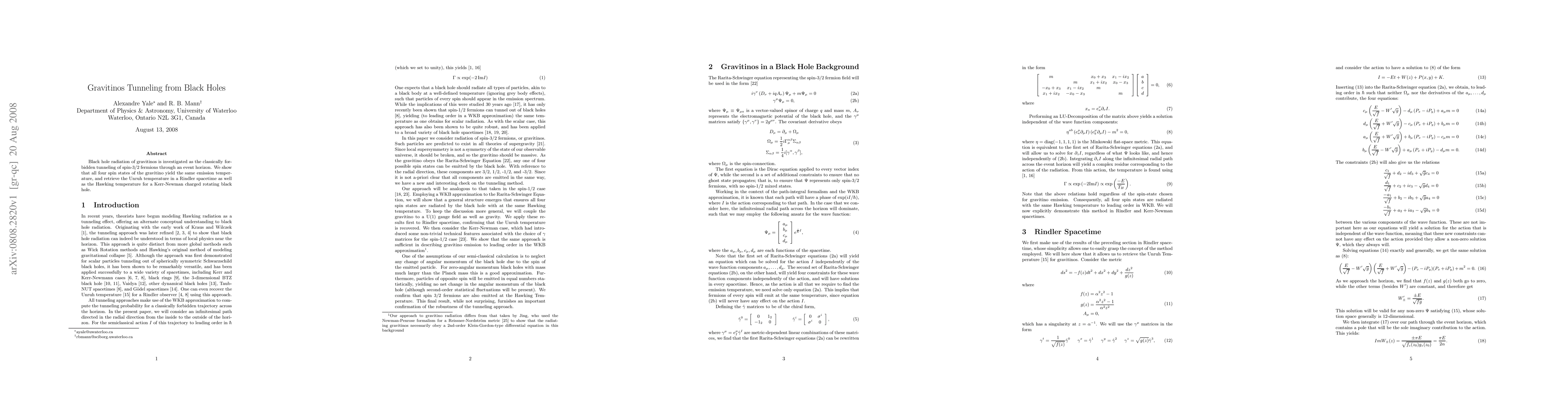 Black hole radiation of gravitinos is investigated as the classically forbidden tunneling of spin-3/2 fermions through an event horizon. We show that all four spin states of the gravitino yield the same emission temperature, and retrieve the Unruh temperature in a Rindler spacetime as well as the Hawking temperature for a Kerr-Newman charged rotating black hole.