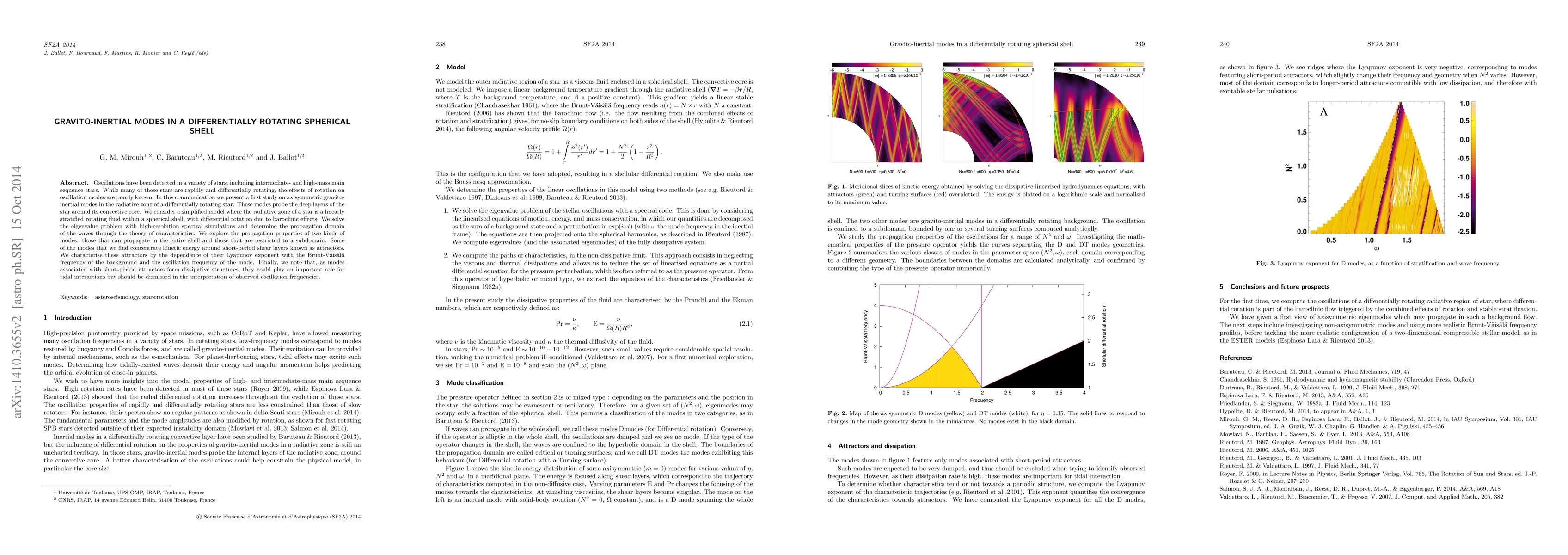 Oscillations have been detected in a variety of stars, including intermediate- and high-mass main sequence stars. While many of these stars are rapidly and differentially rotating, the effects of rotation on oscillation modes are poorly known. In this communication we present a first study on axisymmetric gravito-inertial modes in the radiative zone of a differentially rotating star. These modes probe the deep layers of the star around its convective core. We consider a simplified model where the radiative zone of a star is a linearly stratified rotating fluid within a spherical shell, with differential rotation due to baroclinic effects. We solve the eigenvalue problem with high-resolution spectral simulations and determine the propagation domain of the waves through the theory of characteristics. We explore the propagation properties of two kinds of modes: those that can propagate in the entire shell and those that are restricted to a subdomain. Some of the modes that we find concentrate kinetic energy around short-period shear layers known as attractors. We characterise these attractors by the dependence of their Lyapunov exponent with the \BV frequency of the background and the oscillation frequency of the mode. Finally, we note that, as modes associated with short-period attractors form dissipative structures, they could play an important role for tidal interactions but should be dismissed in the interpretation of observed oscillation frequencies.