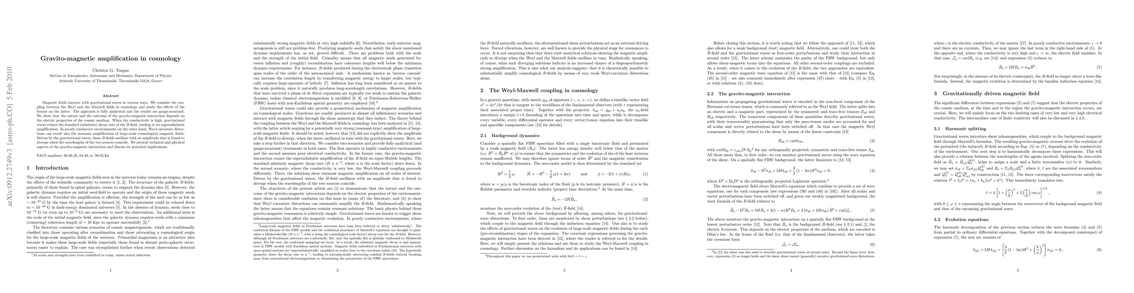 This paper analytically investigates the coupling between Weyl and Maxwell fields in cosmology, demonstrating that gravito-magnetic interactions can amplify magnetic fields depending on the cosmic medium's conductivity. High conductivity leads to superadiabatic B-field amplification, while low conductivity results in resonant amplification driven by gravitational waves.
