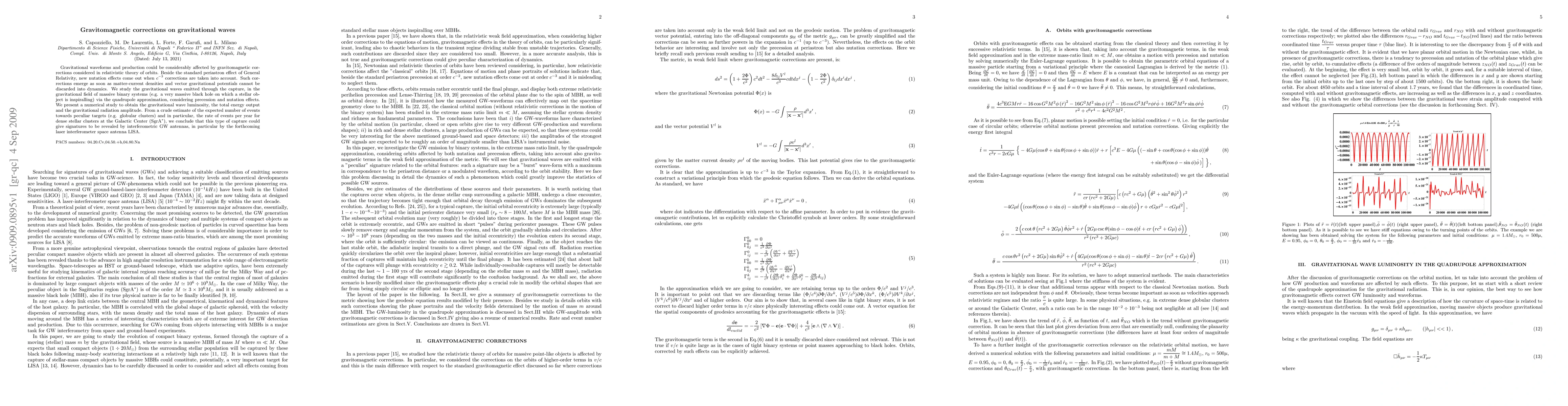 Gravitational waveforms and production could be considerably affected by gravitomagnetic corrections considered in relativistic theory of orbits. Beside the standard periastron effect of General Relativity, new nutation effects come out when c^{-3} corrections are taken into account. Such corrections emerge as soon as matter-current densities and vector gravitational potentials cannot be discarded into dynamics. We study the gravitational waves emitted through the capture, in the gravitational field of massive binary systems (e.g. a very massive black hole on which a stellar object is inspiralling) via the quadrupole approximation, considering precession and nutation effects. We present a numerical study to obtain the gravitational wave luminosity, the total energy output and the gravitational radiation amplitude. From a crude estimate of the expected number of events towards peculiar targets (e.g. globular clusters) and in particular, the rate of events per year for dense stellar clusters at the Galactic Center (SgrA*), we conclude that this type of capture could give signatures to be revealed by interferometric GW antennas, in particular by the forthcoming laser interferometer space antenna LISA.