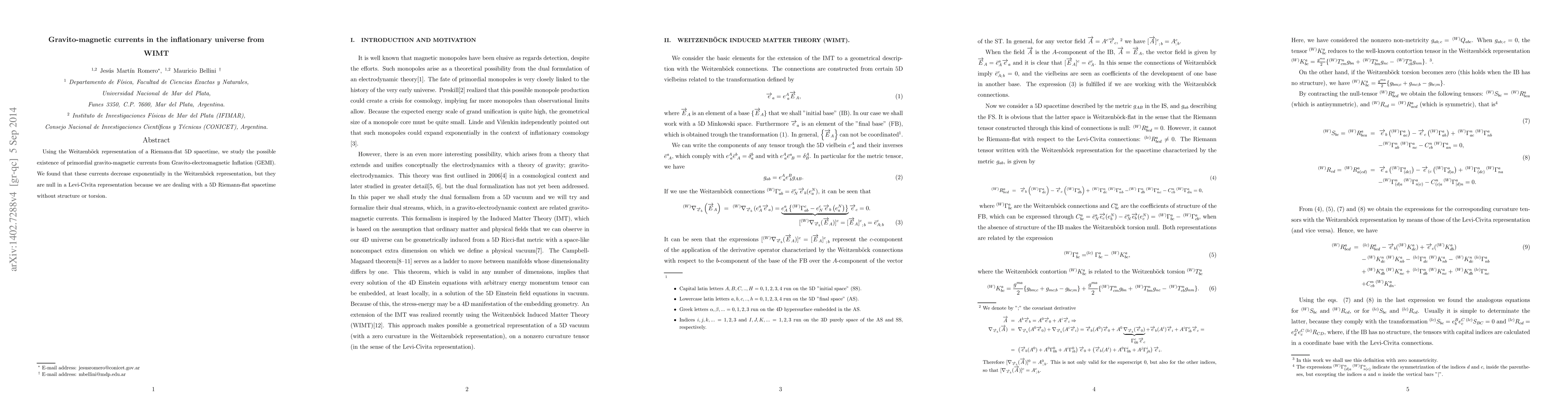 Using the Weitzenb\"ock representation of a Riemann-flat 5D spacetime, we study the possible existence of primordial gravito-magnetic currents from Gravito-electromagnetic Inflation (GEMI). We found that these currents decrease exponentially in the Weitzenb\"ock representation, but they are null in a Levi-Civita representation because we are dealing with a 5D Riemann-flat spacetime without structure or torsion.