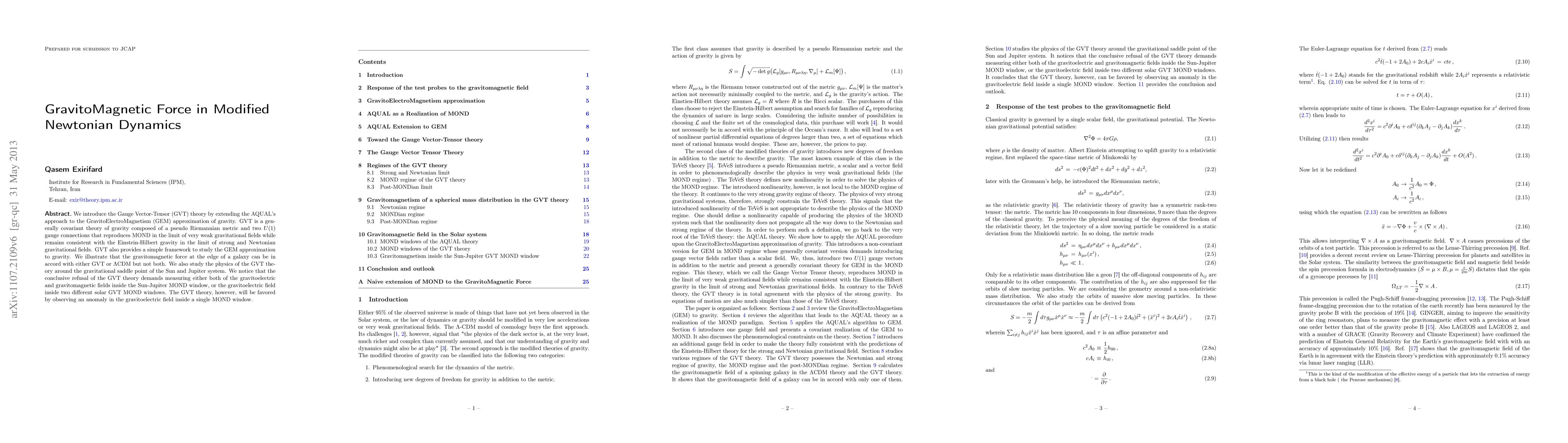 We introduce the Gauge Vector-Tensor (GVT) theory by extending the AQUAL's approach to the GravitoElectroMagnetism (GEM) approximation of gravity. GVT is a generally covariant theory of gravity composed of a pseudo Riemannian metric and two U(1) gauge connections that reproduces MOND in the limit of very weak gravitational fields while remains consistent with the Einstein-Hilbert gravity in the limit of strong and Newtonian gravitational fields. GVT also provides a simple framework to study the GEM approximation to gravity. We illustrate that the gravitomagnetic force at the edge of a galaxy can be in accord with either GVT or \Lambda CDM but not both. We also study the physics of the GVT theory around the gravitational saddle point of the Sun and Jupiter system. We notice that the conclusive refusal of the GVT theory demands measuring either both of the gravitoelectric and gravitomagnetic fields inside the Sun-Jupiter MOND window, or the gravitoelectric field inside two different solar GVT MOND windows. The GVT theory, however, will be favored by observing an anomaly in the gravitoelectric field inside a single MOND window.