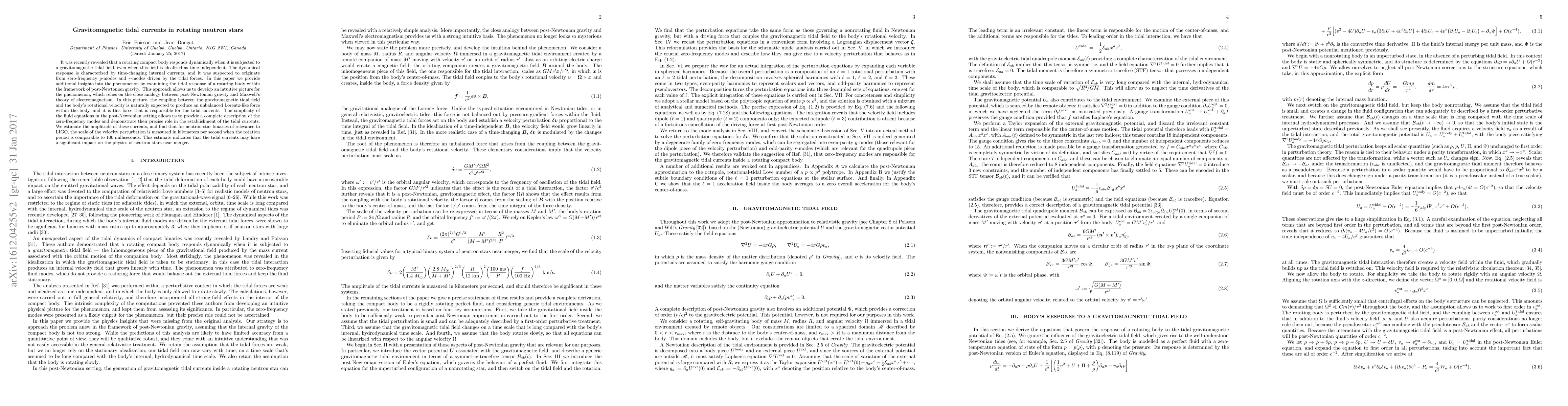 This paper explores the dynamical response of rotating neutron stars to gravitomagnetic tidal fields, revealing time-changing internal currents driven by zero-frequency g-modes and r-modes. Using post-Newtonian gravity, it provides a clear picture of the phenomenon, showing that the coupling between the tidal field and rotation generates an unbalanced force responsible for these tidal currents, with significant implications for the physics of neutron stars near merger.