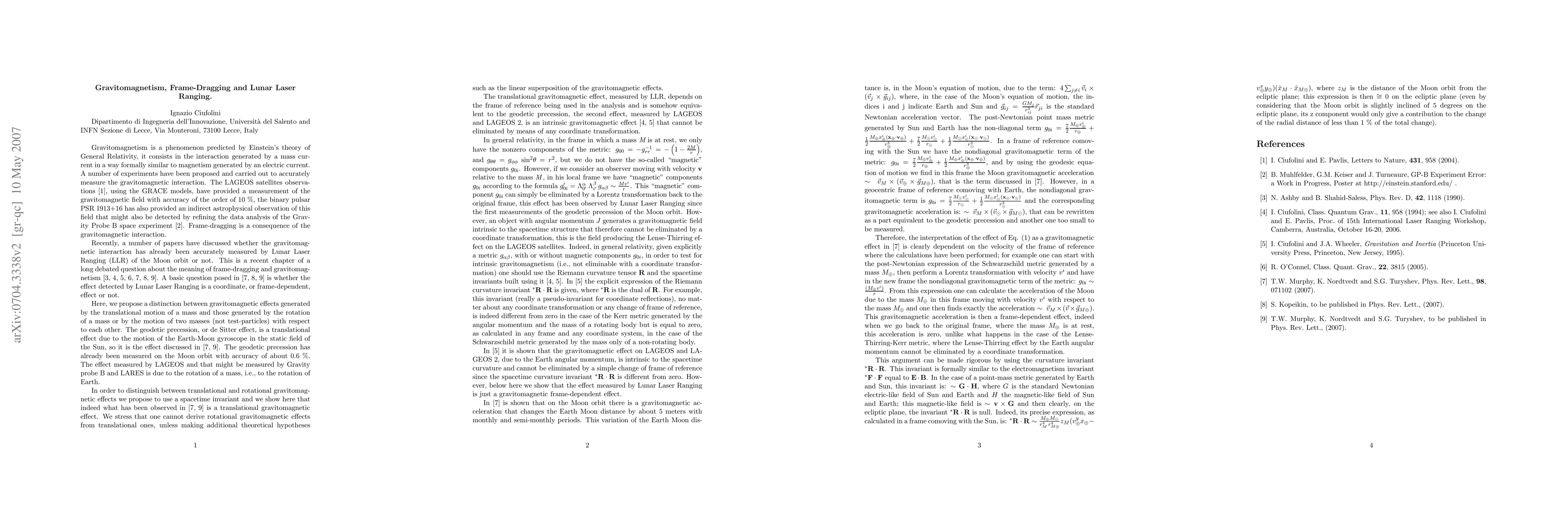 We discuss here the measurement of gravitomagnetism and frame dragging with Lunar Laser Ranging, LAGEOS and LARES Satellites, and Gravity Probe B.